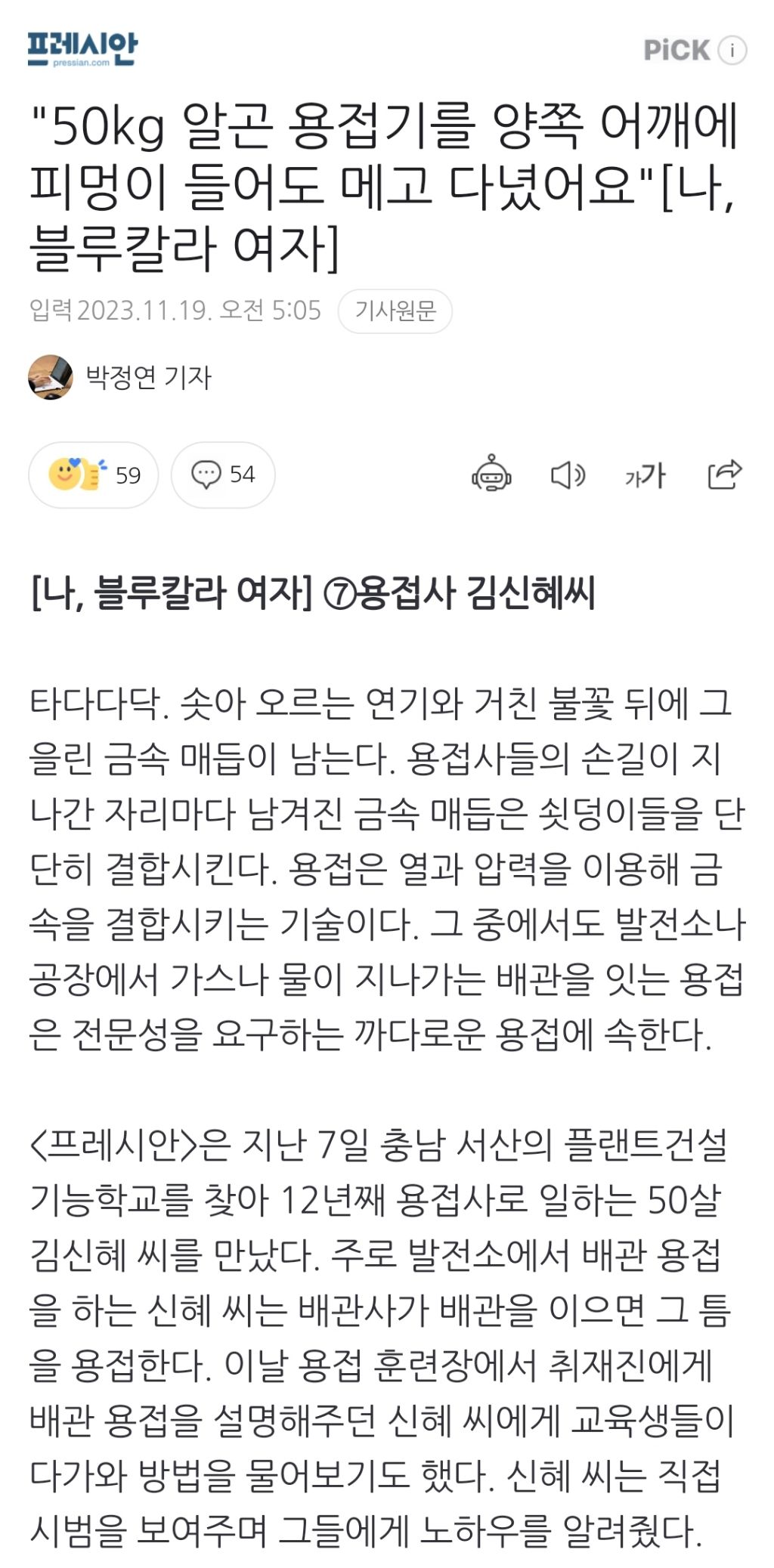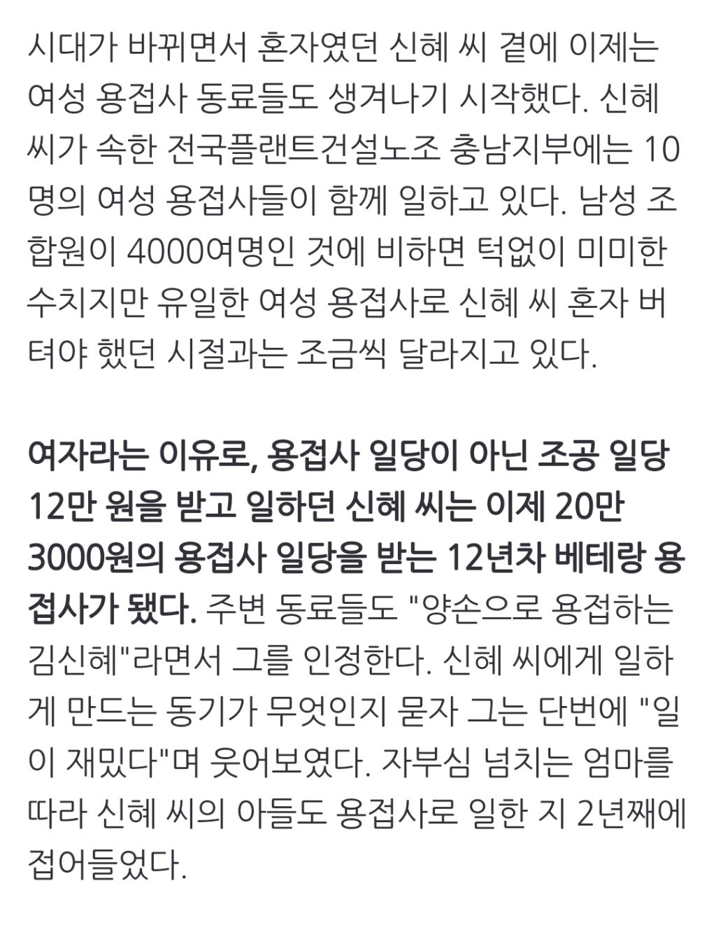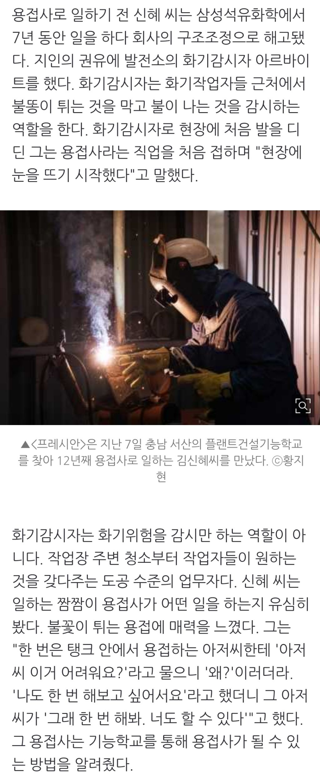 [여시뉴스데스크]"50kg 알곤 용접기를 양쪽 어깨에 피멍이 들어도 메고 다녔어요"[나, 블루칼라 여자] 작성자천리길|작성시간23.11.21|조회수8,092 목록 댓글 2 글자크기 작게가 글자크기 크게가 출처 : https://naver.me/FRcCNMXZ"50kg 알곤 용접기를 양쪽 어깨에 피멍이 들어도 메고 다녔어요"[나, 블루칼라 여자]⑦용접사 김신혜씨 타다다닥. 솟아 오르는 연기와 거친 불꽃 뒤에 그을린 금속 매듭이 남는다. 용접사들의 손길이 지나간 자리마다 남겨진 금속 매듭은 쇳덩이들을 단단히 결합시킨다. 용접은 n.news.naver.com중략이하 생략전문 출처로 다음검색 현재 게시글 추가 기능 열기 북마크 공유하기 신고 센터로 신고 댓글 댓글 2 댓글쓰기 답글쓰기 댓글 리스트 작성자이른게아닌가 | 작성시간 23.11.21 이 시리즈 진짜 좋다..! 작성자여성시대_댓글알리미 | 작성시간 23.11.21 ※ 여성시대 인기글 알림 봇 v1.2.0※ 연속 등극 시 최대 3회까지 기록됩니다.※ 자세한 내용은 프로필 게시글을 참고해주세요.✧⋄⋆⋅⋆⋄✧⋄⋆⋅⋆⋄✧⋄⋆⋅⋆⋄✧⋄⋆⋅⋆⋄✧2023년 11월 21일(화) 02시 - 인기글 56위 🎉2023년 11월 21일(화) 03시 - 인기글 88위 🎉 댓글 전체보기