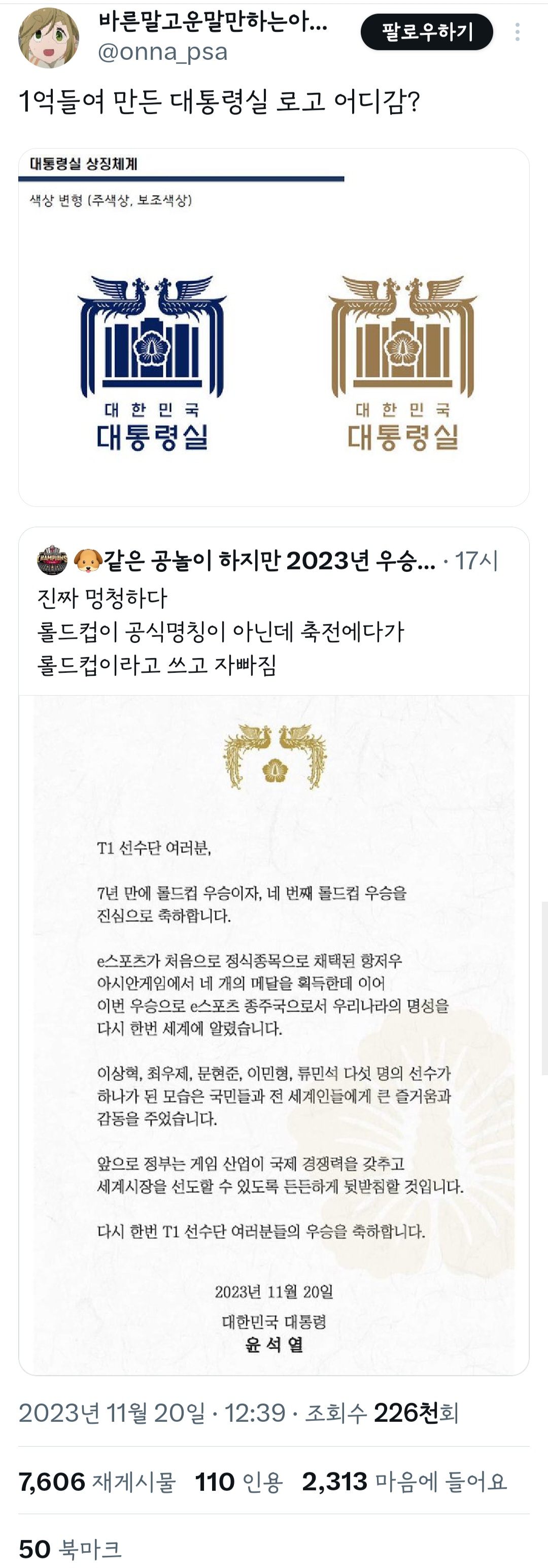 [기타]1억들여 만든 대통령실 로고 어디감? 작성자서지혜.|작성시간23.11.21|조회수13,378 목록 댓글 48 글자크기 작게가 글자크기 크게가 출처 : https://twitter.com/onna_psa/status/1726445250632360413?t=FDbtSAOrwCnPN9dB_545fw&s=19 다음검색 현재 게시글 추가 기능 열기 북마크 공유하기 신고 센터로 신고 댓글 댓글 48 댓글쓰기 답글쓰기 댓글 리스트 작성자션슈 | 작성시간 23.11.21 문과 문 대통령 보고싶다 작성자휴먼한인간 | 작성시간 23.11.21 ...ㅋㅋ.. .... 작성자김겨울민정 | 작성시간 23.11.21 개창피하다 작성자윤석열과2찍들비명횡사지옥행확정 | 작성시간 23.11.21 문장도 개떡같은데 로고 만든다고 헛돈쓰고 돈 빼돌렸네 작성자찐팽 | 작성시간 23.11.21 매일이 꿈같네... 롤드컵 ㅇㅈㄹㅋㅋㅋㅋ 댓글 전체보기