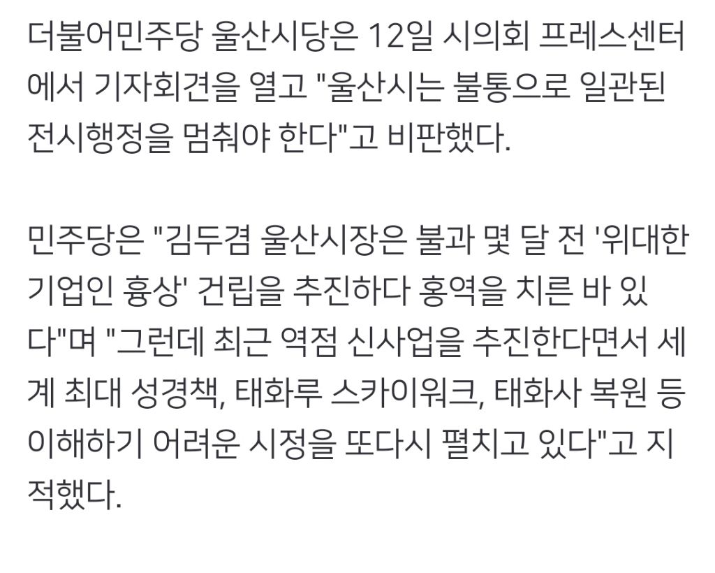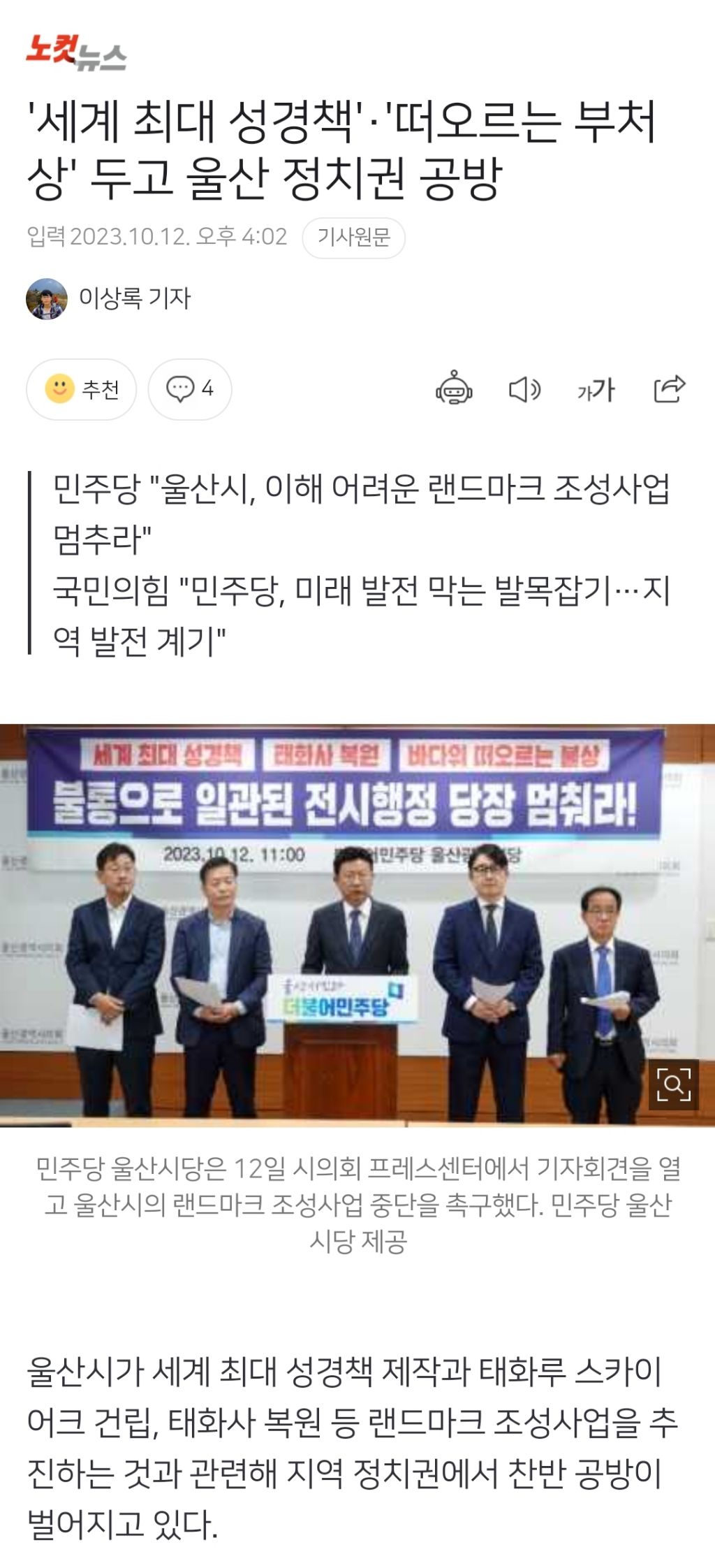 [여시뉴스데스크]'세계 최대 성경책'·'떠오르는 부처상' 두고 울산 정치권 공방 작성자작은 하마|작성시간23.11.21|조회수887 목록 댓글 6 글자크기 작게가 글자크기 크게가 출처 : https://naver.me/GvdzEJPk'세계 최대 성경책'·'떠오르는 부처상' 두고 울산 정치권 공방울산시가 세계 최대 성경책 제작과 태화루 스카이어크 건립, 태화사 복원 등 랜드마크 조성사업을 추진하는 것과 관련해 지역 정치권에서 찬반 공방이 벌어지고 있다. 더불어민주당 울산시당은n.news.naver.com전문 출처로 다음검색 현재 게시글 추가 기능 열기 북마크 공유하기 신고 센터로 신고 댓글 댓글 6 댓글쓰기 답글쓰기 댓글 리스트 작성자꿀백설기 | 작성시간 23.11.21 뭔 생각이지..? 작성자웩에인 | 작성시간 23.11.21 저게 울산이랑 무슨상관인데 만들겠다고 난리야 삭제된 댓글입니다. 답댓글 작성자Solaris | 작성시간 23.11.21 2222 여기는 진짜ㅋㅋㅋ처음에는 기업인들 흉상하겠다하더니 성지순례 장소도 아닌데 최대 성경책한다고 가겠냐고ㅎ 그래놓고 이제와선 부처상이라니 작성자그림 좀 그리자 | 작성시간 23.11.21 아니 이런거 좀 하지말라고 저번에 흉상도 욕 엄청 먹어 놓고 댓글 전체보기