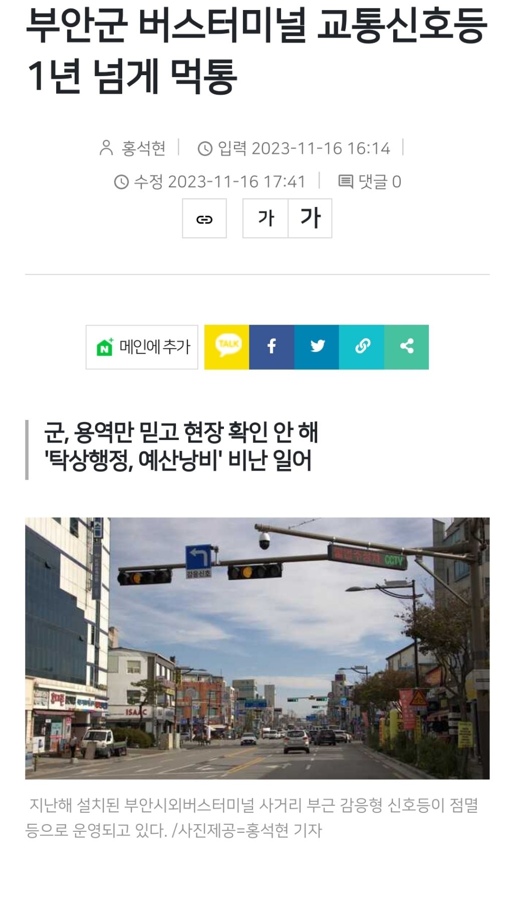 [여시뉴스데스크]부안군 버스터미널 교통신호등 1년 넘게 먹통 작성자작은 하마|작성시간23.11.21|조회수10,102 목록 댓글 2 글자크기 작게가 글자크기 크게가 출처 : https://www.jjan.kr/article/20231116580141부안군 버스터미널 교통신호등 1년 넘게 먹통부안군이 지난해 부안시외버스터미널 사거리 인근 교차로에 설치한 감응형 교통신호등이 1년 넘게 먹통, 예산낭비 비판을 받고 있다. 부안군은 감응형 교통신호체계 도입을 위해 5400만 원을 투www.jjan.kr전문 출처로 다음검색 현재 게시글 추가 기능 열기 북마크 공유하기 신고 센터로 신고 댓글 댓글 2 댓글쓰기 답글쓰기 댓글 리스트 작성자혼술달글을 사랑해 벗 증오해 | 작성시간 23.11.21 아니 일년동안 저걸 수리 안했다고?;; 작성자여성시대_댓글알리미 | 작성시간 23.11.21 ※ 여성시대 인기글 알림 봇 v1.2.0※ 연속 등극 시 최대 3회까지 기록됩니다.※ 자세한 내용은 프로필 게시글을 참고해주세요.✧⋄⋆⋅⋆⋄✧⋄⋆⋅⋆⋄✧⋄⋆⋅⋆⋄✧⋄⋆⋅⋆⋄✧2023년 11월 21일(화) 15시 - 인기글 44위 🎉2023년 11월 21일(화) 16시 - 인기글 98위 🎉 댓글 전체보기