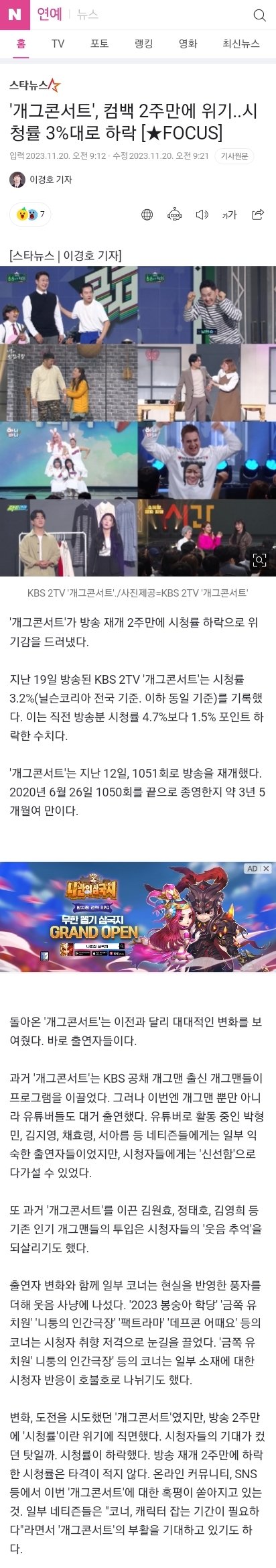 [여시뉴스데스크]'개그콘서트', 컴백 2주만에 위기..시청률 3%대로 하락 [★FOCUS] 작성자트트치치|작성시간23.11.21|조회수4,574 목록 댓글 41 글자크기 작게가 글자크기 크게가 출처 : https://n.news.naver.com/entertain/article/108/0003196022'개그콘서트', 컴백 2주만에 위기..시청률 3%대로 하락 [★FOCUS]'개그콘서트'가 방송 재개 2주만에 시청률 하락으로 위기감을 드러냈다. 지난 19일 방송된 KBS 2TV '개그콘서트'는 시청률 3.2%(닐슨코리아 전국 기준. 이하 동일 기준)를 기록했다. 이는 직전 방송분n.news.naver.com벌써 위기?;;;;; 다음검색 현재 게시글 추가 기능 열기 북마크 공유하기 신고 센터로 신고 댓글 댓글 41 댓글쓰기 답글쓰기 댓글 리스트 작성자칷 11월이네 벌써 | 작성시간 23.11.21 ㅋㅋ 작성자수줍고 말수가 적은 여시 | 작성시간 23.11.21 진짜 먹고살기 힘들겠다... 작성자모르는개 산책. | 작성시간 23.11.21 왜겠어 작성자겨울에는춥다 | 작성시간 23.11.21 3퍼도 높네 작성자.....죠? | 작성시간 23.11.21 3퍼나 나오노 댓글 전체보기