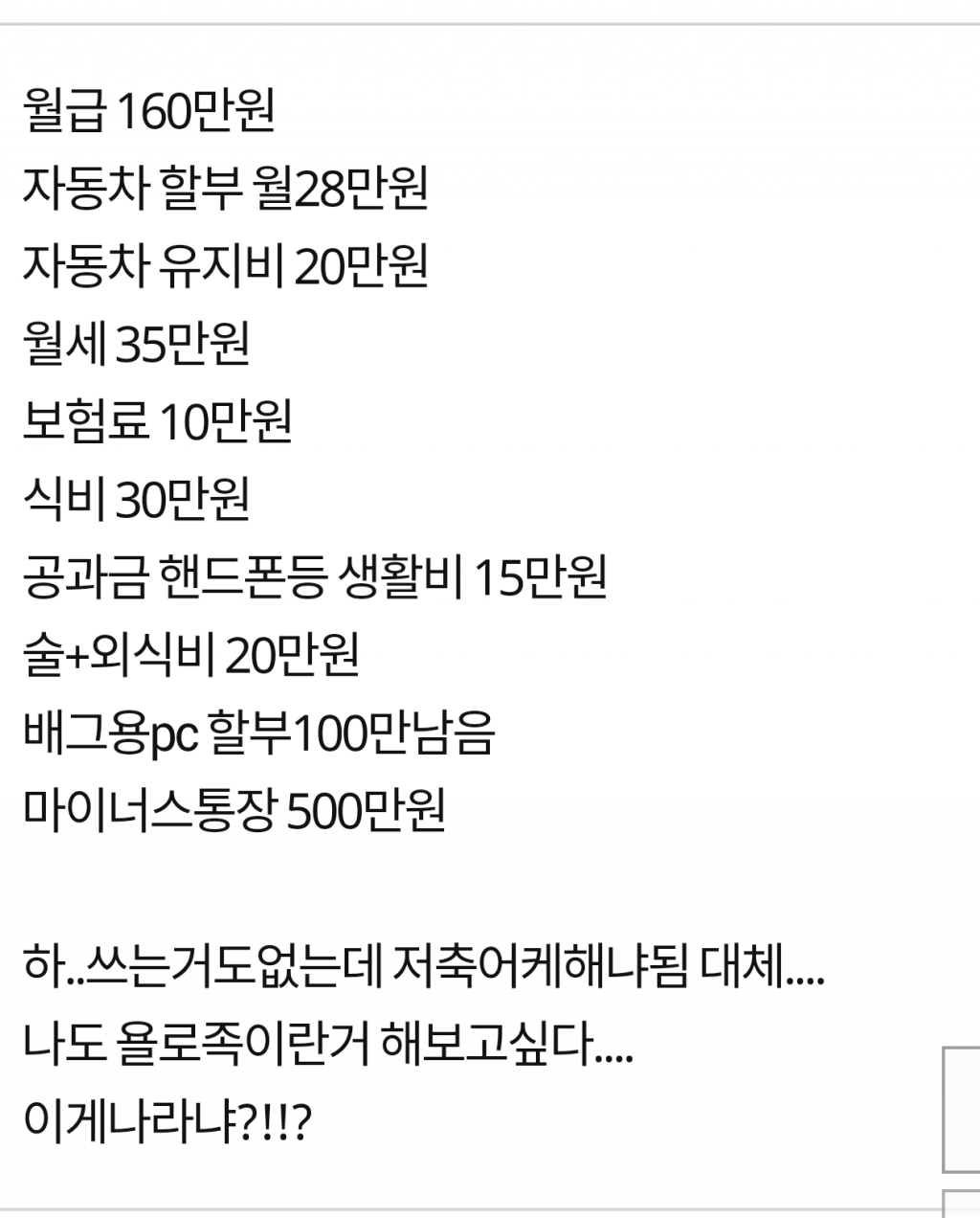[스크랩] [흥미돋]월 160만원 남자의 가계부 작성자치즈기|작성시간23.11.22|조회수10,514 목록 댓글 39 글자크기 작게가 글자크기 크게가 다음검색 스크랩 원문 : 비공개카페 현재 게시글 추가 기능 열기 북마크 공유하기 신고 센터로 신고 댓글 댓글 39 댓글쓰기 답글쓰기 댓글 리스트 작성자HWAI | 작성시간 23.11.22 자동차랑 컴퓨터 왜삼? 돈 모아서 사야지 작성자你爸也是韩男 | 작성시간 23.11.22 충분히 욜로인데 작성자연경언니나랑살아줘 | 작성시간 23.11.22 마통도 이해 안 되는데 에휴 작성자살랑 | 작성시간 23.11.22 저 월급에 차를... 작성자냥집사29 | 작성시간 23.11.22 충분히 욜로아닌가.. 댓글 전체보기