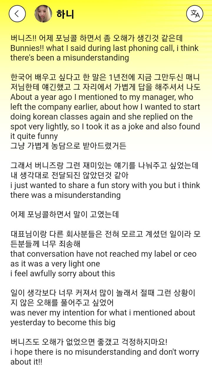 > 하니가 '매니저 한 명이랑 가볍게 나눴던 얘기고 대표님이나 회사직원들은 내가 한국어 더 배우고 싶어하는 줄 모르고 있었다, 여러분들이 오해하는 그런 의미 아니었다'고 해명함