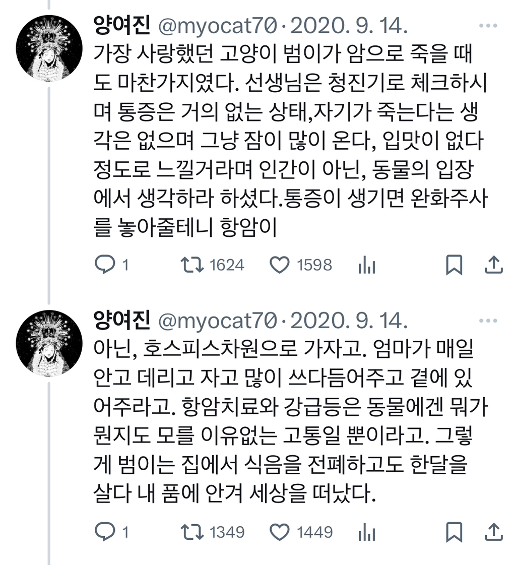 작성자야옹 얏홍 작성시간 23.11.23 ㅠㅠㅠㅠ저렇게 통증없이 내가 마지막까지 안아주다 가면 좋겠어... 내내 아파서 마지막에 병원에있다가 가는거도 못보고 이별하면 진짜 가슴 미어질거같아