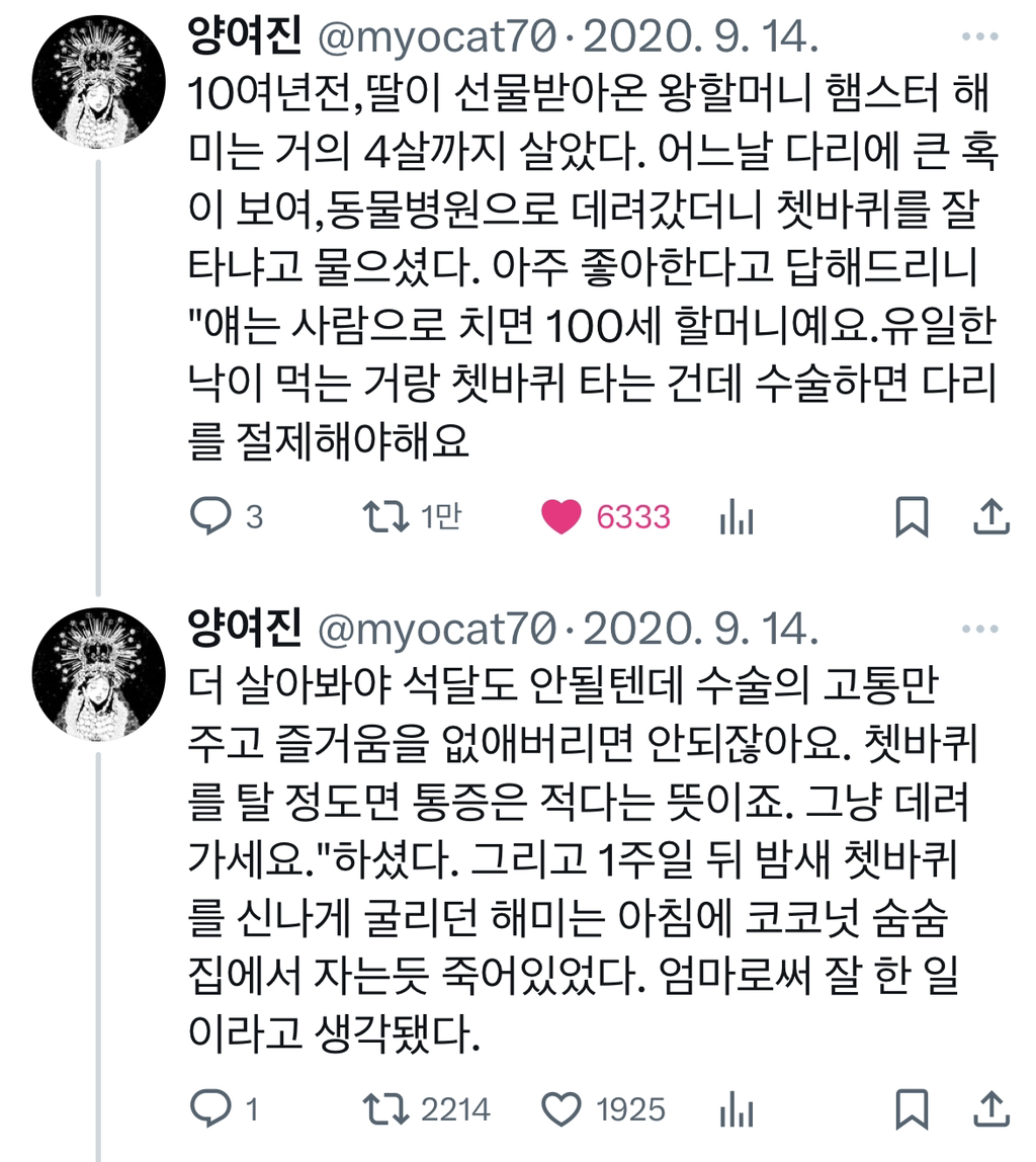 작성자푸바오오오옹 작성시간 23.11.23 맞아…하루라도 더 내 곁에 머물게 하고싶은데 애들은 그만큼 고통이 길어질테니 저기서 선택해야하는 것이 넘 어려웠어….ㅠㅠ 동물들은 왜 수명이 짧은걸까.. 더도말고 덜도말고 나랑 똑같이만 살다가 함께 가고싶다
