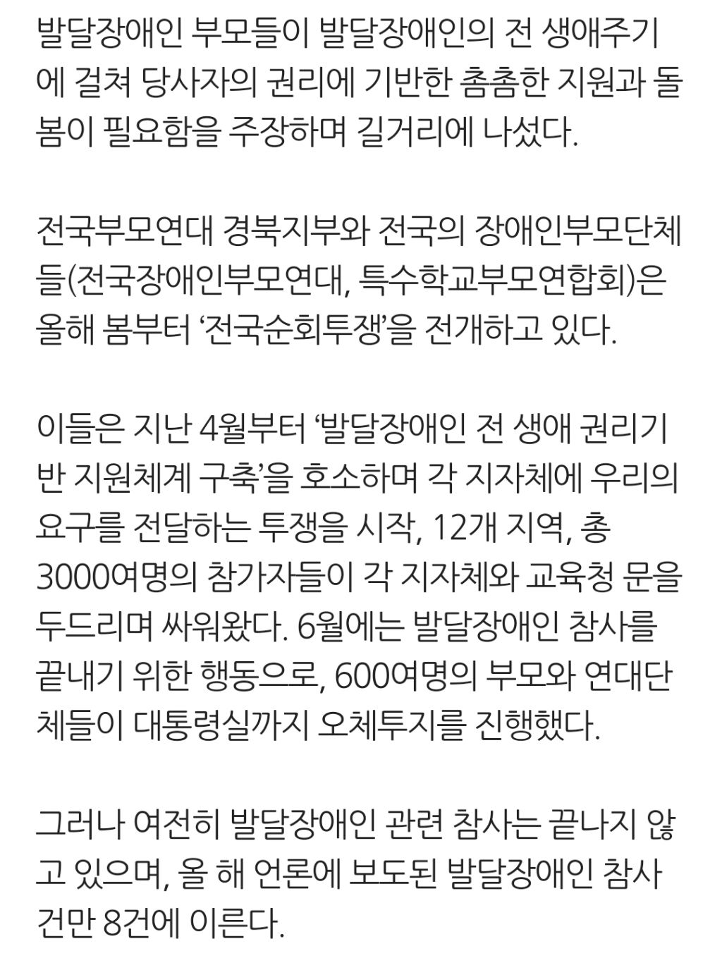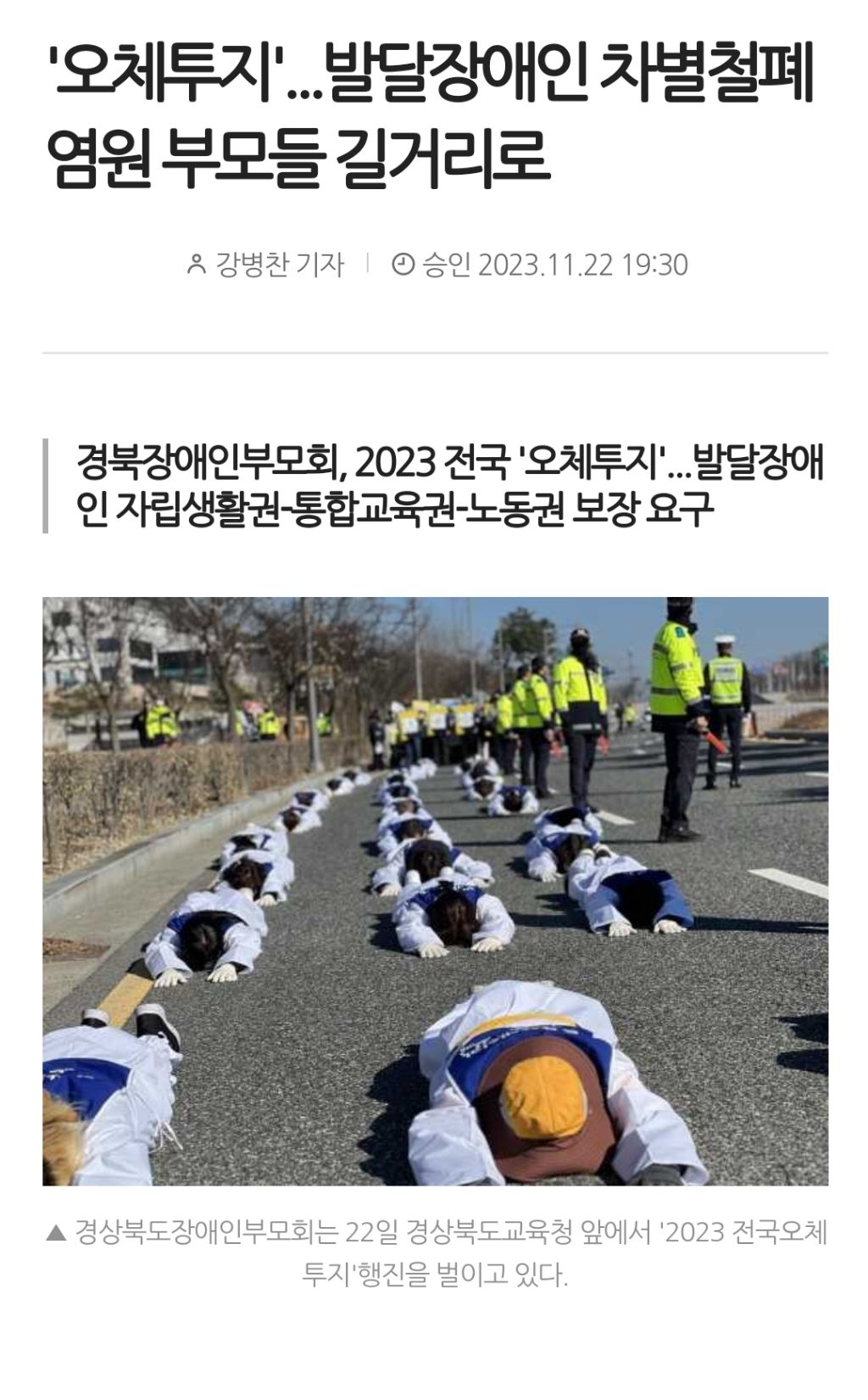 [여시뉴스데스크]'오체투지'...발달장애인 차별철폐 염원 부모들 길거리로 작성자천리길|작성시간23.11.22|조회수1,221 목록 댓글 2 글자크기 작게가 글자크기 크게가 출처 : https://www.dkilbo.com/news/articleView.html?idxno=420783'오체투지'...발달장애인 차별철폐 염원 부모들 길거리로 - 대경일보발달장애인 부모들이 발달장애인의 전 생애주기에 걸쳐 당사자의 권리에 기반한 촘촘한 지원과 돌봄이 필요함을 주장하며 길거리에 나섰다. 전국부모연대 경북지부와 전국의 장애인부모단체www.dkilbo.com이하 생략전문 출처로 다음검색 현재 게시글 추가 기능 열기 북마크 공유하기 신고 센터로 신고 댓글 댓글 2 댓글쓰기 답글쓰기 댓글 리스트 작성자거참히않하뇌 | 작성시간 23.11.22 에휴 추운데 고생이시네.. 대체 왜 저런 시위를 해야 되는거야 하야해 작성자올리비아 벤슨 | 작성시간 23.11.23 국가가 나서줘야해 진짜..ㅠ 댓글 전체보기