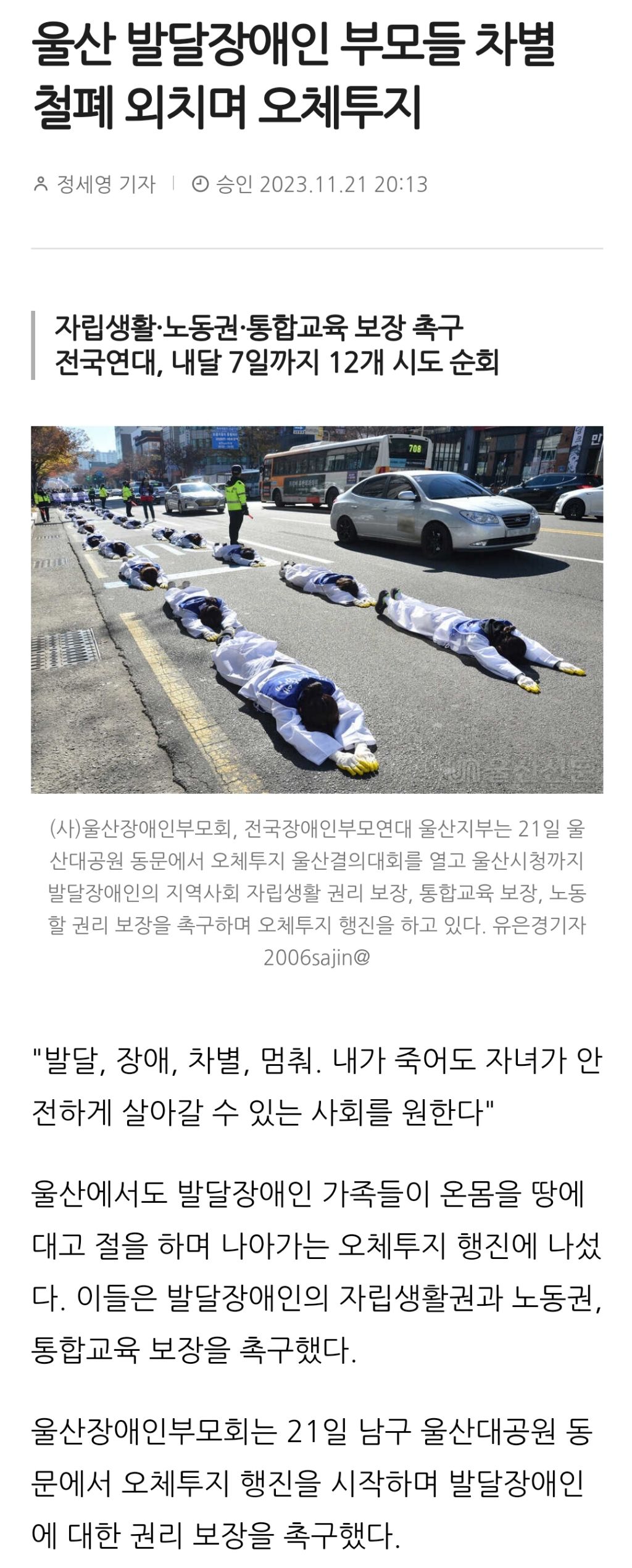 [여시뉴스데스크]울산 발달장애인 부모들 차별 철폐 외치며 오체투지 작성자천리길|작성시간23.11.22|조회수3,084 목록 댓글 7 글자크기 작게가 글자크기 크게가 출처 : https://www.ulsanpress.net/news/articleView.html?idxno=516622울산 발달장애인 부모들 차별 철폐 외치며 오체투지 www.ulsanpress.net전문 출처로중략 다음검색 현재 게시글 추가 기능 열기 북마크 공유하기 신고 센터로 신고 댓글 댓글 7 댓글쓰기 답글쓰기 댓글 리스트 작성자홈플러스원쁠원 | 작성시간 23.11.23 응원합니다 작성자내이브러 | 작성시간 23.11.23 힘내세요 응원합니다. 작성자먹방찍고맛보고즐기고 | 작성시간 23.11.23 왜 저들은 시위를 저렇게 필사적으로 온몸을 던져가며 할 수 밖에 없는가...생각하면 마음이 씁쓸해.. 장애인들에 대한 사회적 시선이나 복지가 다른 선진국만큼 더 좋아졌음 좋겠어 작성자행복행운좋은사람 | 작성시간 23.11.23 응원합니다 작성자장모망고 | 작성시간 23.11.23 제발 복지랑 인식 개선에 좀 .. 댓글 전체보기