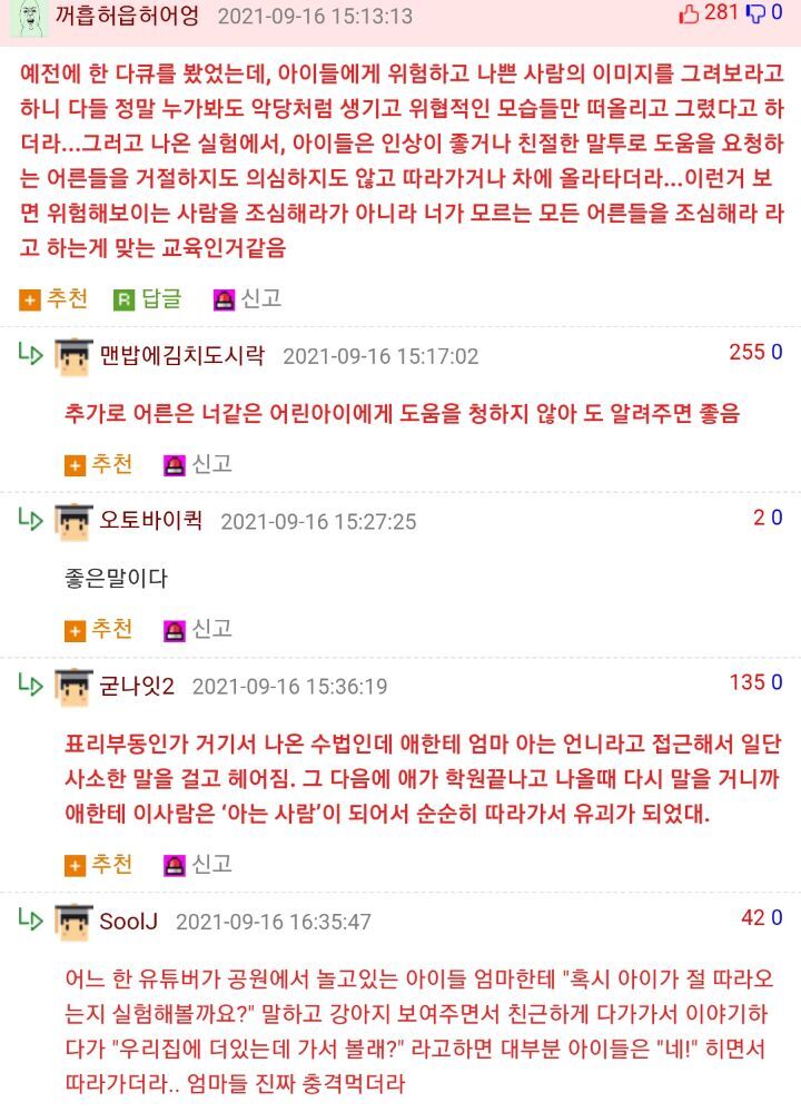 작성자밀물장어 작성시간 23.11.23 맞아나 어렸을 때도 도깨비 같은 사람들이 잡아가고 늑대가 잡아가고 이런 식의 스토리로 배웠는데 요즘 아이들은 다른 식으로 배운다고 하더라 ...! 베댓의 댓글처럼 어른은 아이에게 도움을 청하지 않는다라고 가르치는 것도 효과적이라고 ! 근데 또 아이들은 막상 친절하고 선하게 생긴 사람들에 대한 경계가 업ㄹ어 ㅠㅠㅠㅠ