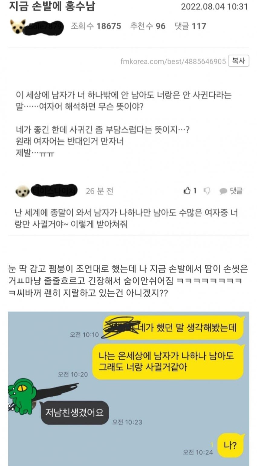 자의식 과잉 전세계 인구중 남자가 자기 하나면 여자를 고를수 있단 자신감은 어디서 나오지 물론 반대면 더 가능성없지만 니가 소수여도 가능성없으세요 ㅋㅋㅋ