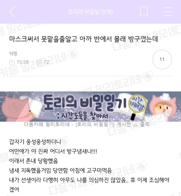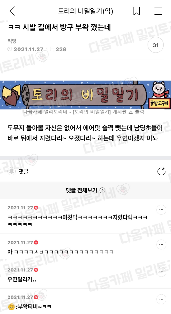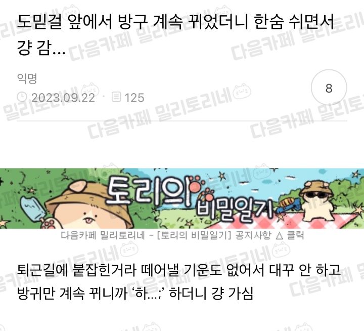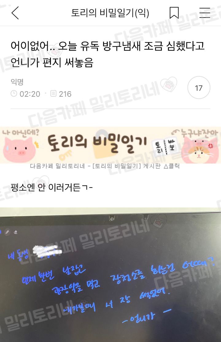 *여성시대* 차분한 20대들의 알흠다운 공간 [배꼽의행방]도믿걸 앞에서 방구 계속 뀌었더니 한숨 쉬면서 걍 감... 작성시간23.11.27|조회수64,869 목록 댓글 18 글자크기 작게가 글자크기 크게가 출처 : 여성시대 한 페이지1차 출처 밀리토리네 다음검색 현재 게시글 추가 기능 열기 북마크 공유하기 신고 센터로 신고 댓글 18 댓글 리스트 작성시간 23.11.27 ㅋㅋㅋㅋㅋㅋㅋㅋㅋㅋㅋㅋㅋㅋㅋㅋ 작성시간 23.11.27 글에서 방구 냄새 나 작성시간 23.11.27 방구얘기 언제 안웃겨짐? 작성시간 23.11.27 아 진짜 1나개도 안웃긴게 없다 작성시간 23.11.27 아 존나 웃기다ㅠㅠㅠㅠㅠㅋㅋㅋㅋㅋㅋㅋㅋㅋㅋㅋㅋㅋㅋㅋㅋ 카페 방문해 더 많은 댓글 만나기!
