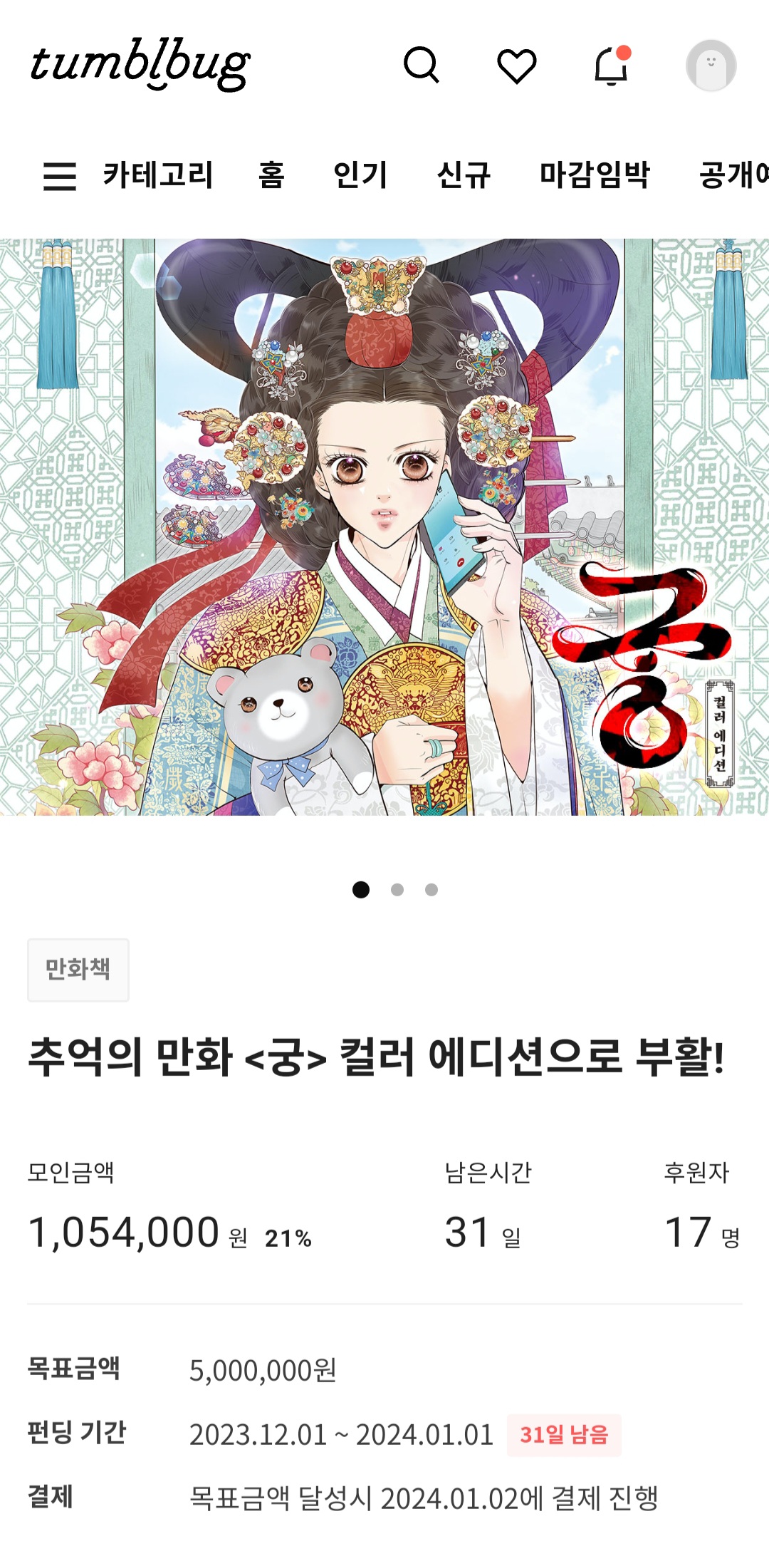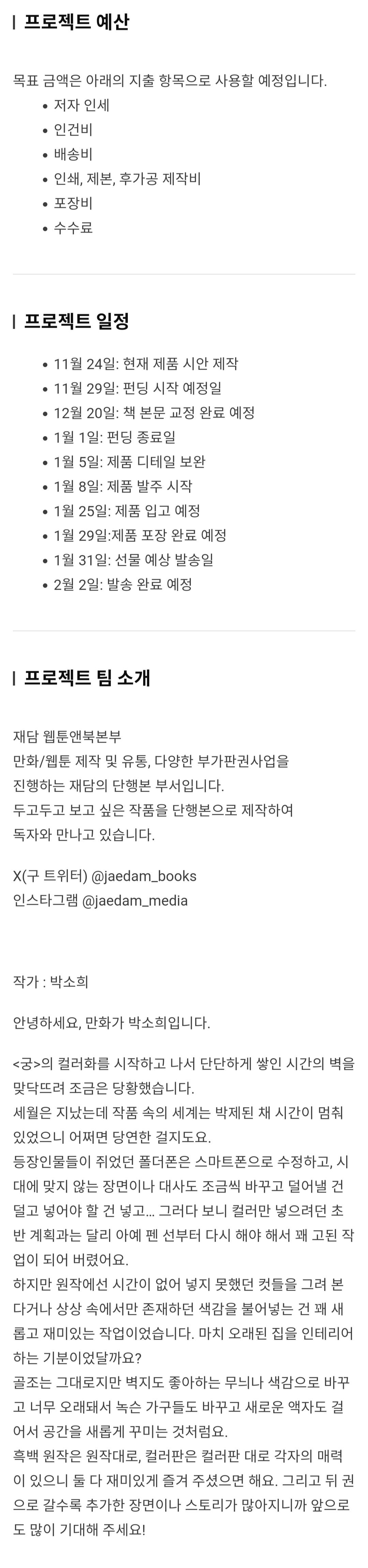 [흥미돋]추억의 만화 <궁> 컬러 에디션으로 부활! (궁 컬러 단행본 펀딩) 작성자서지혜.|작성시간23.12.01|조회수4,713 목록 댓글 34 글자크기 작게가 글자크기 크게가 출처 : https://tumblbug.com/goongcolor1-3오늘부터 펀딩 시작함 다음검색 현재 게시글 추가 기능 열기 북마크 공유하기 신고 센터로 신고 댓글 댓글 34 댓글쓰기 답글쓰기 댓글 리스트 작성자그강을건널까말까 | 작성시간 23.12.01 전권...전권해줘요... 작성자혁재 | 작성시간 23.12.01 오 전권 하기엔 좀 많아서 먼저 1부로 나오는건가 나중에 다 나왔으면 좋겠다.. 작성자여시그만하고공부해 | 작성시간 23.12.01 채경이 이제 스마터폰 쓰노 ㅜㅜ 작성자에너제틱 | 작성시간 23.12.01 와..사고싶다.... 작성자론 위즐리 | 작성시간 23.12.02 헉 생각보다 저렴한데? 댓글 전체보기