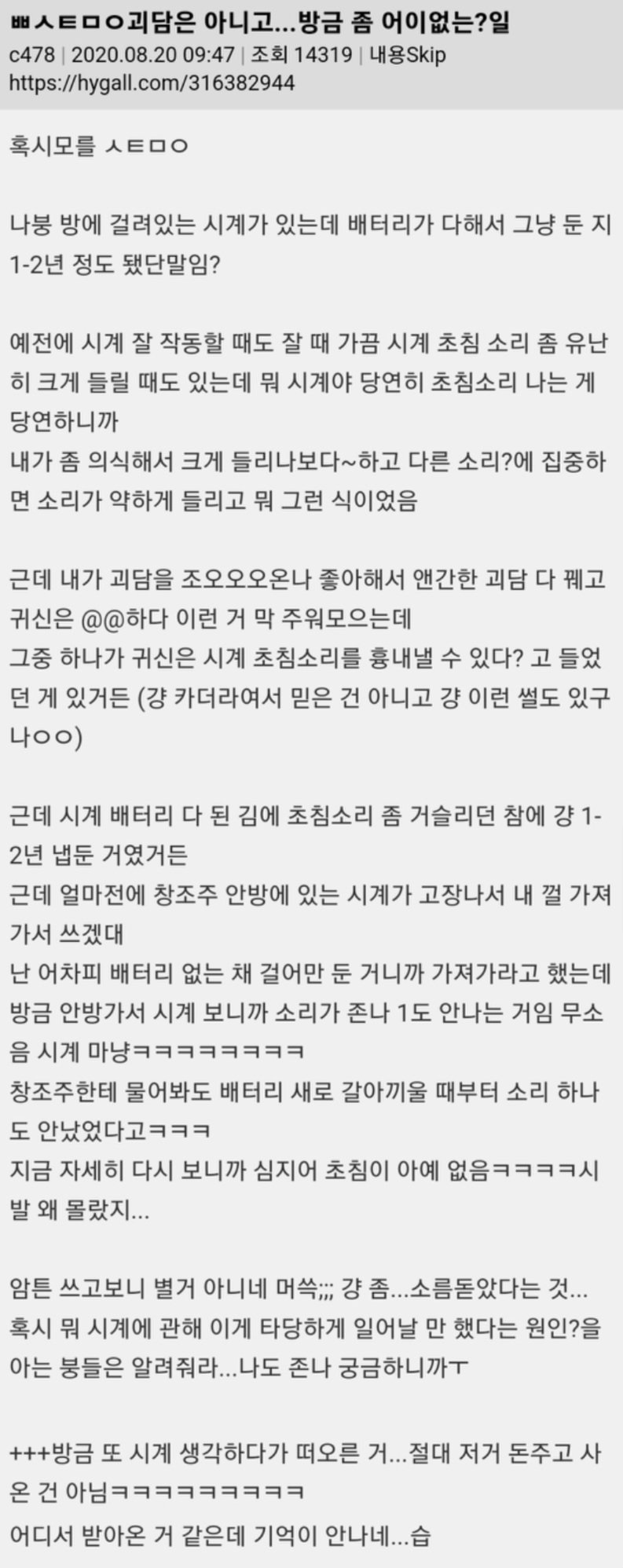[스크랩] [흥미돋]귀신은 시계 초침 소리 흉내낼 수 있다고 들었거든 작성자X file|작성시간23.12.05|조회수5,593 목록 댓글 29 글자크기 작게가 글자크기 크게가 다음검색 스크랩 원문 : 쭉빵카페 현재 게시글 추가 기능 열기 북마크 공유하기 신고 센터로 신고 댓글 댓글 29 댓글쓰기 답글쓰기 댓글 리스트 작성자액희홀앙희 | 작성시간 23.12.05 무서웠는데 댓글보고 괜찮아졌어,,, 작성자설찬 | 작성시간 23.12.05 귀신도 나랑 있으면 심장 떨려서 1초 딱딱 아는 건가 작성자neptune | 작성시간 23.12.05 오 가위 자주 눌리는 내 친구도 시계초침소리 들린댔는데.. 집에 전자시계말고 없는데도 작성자찰리 허냄 | 작성시간 23.12.05 메트로놈 귀신 작성자릴레쓰고우 | 작성시간 23.12.05 개인기도 있고 귀신 대단하네 댓글 전체보기