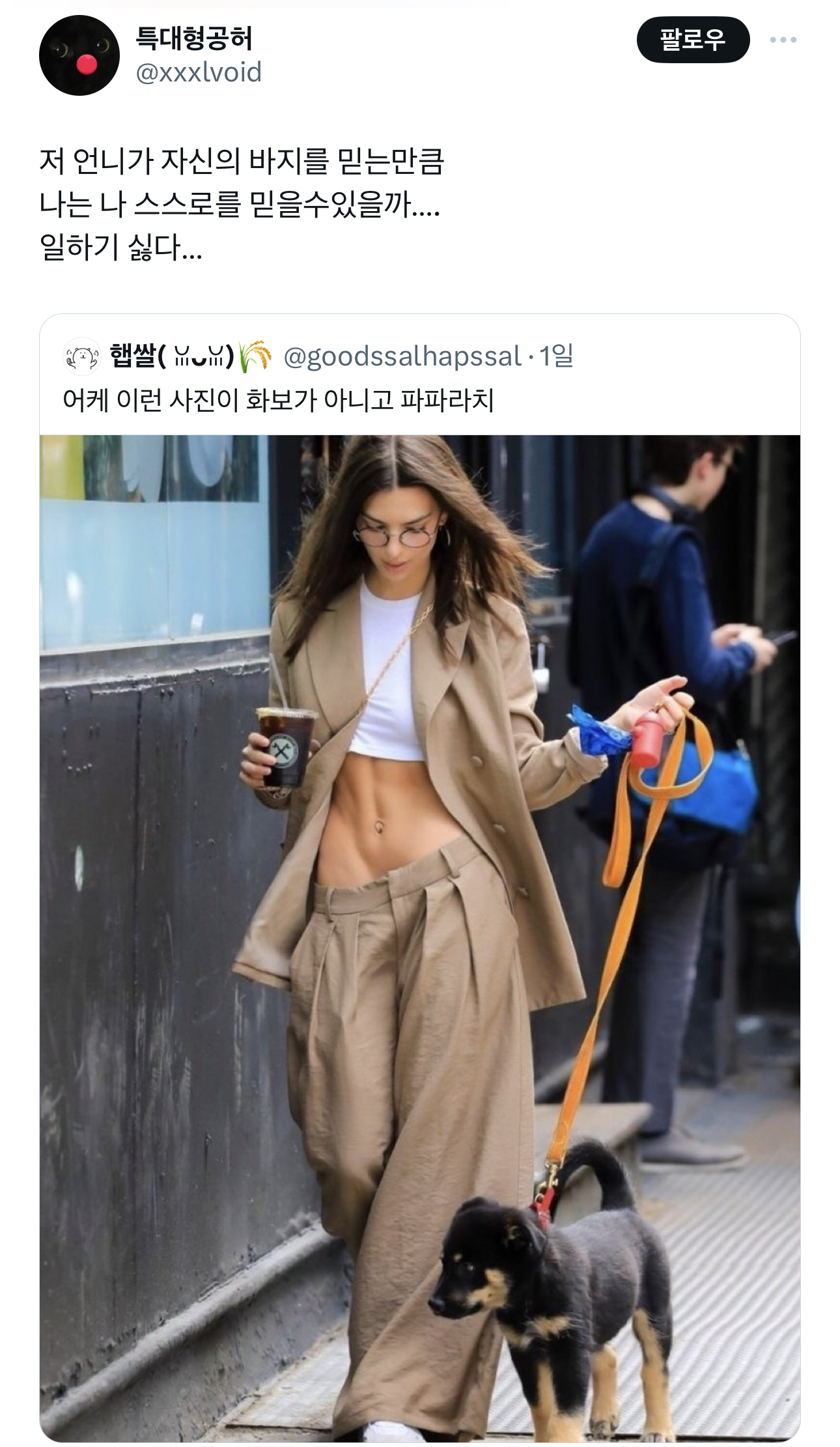 [흥미돋]저 언니가 자신의 바지를 믿는만큼 작성자X file|작성시간23.12.06|조회수19,427 목록 댓글 32 글자크기 작게가 글자크기 크게가 출처 : https://x.com/xxxlvoid/status/1732074427918012451?s=46&t=v7QMmEln8v7WsADFKYn65gX의 특대형공허님(@xxxlvoid)저 언니가 자신의 바지를 믿는만큼 나는 나 스스로를 믿을수있을까…. 일하기 싫다…twitter.com 다음검색 현재 게시글 추가 기능 열기 북마크 공유하기 신고 센터로 신고 댓글 댓글 32 댓글쓰기 답글쓰기 댓글 리스트 작성자유노유노 | 작성시간 23.12.06 복근ㅁㅊ 작성자갓생살날온다 | 작성시간 23.12.06 이번주 저렇게 수영복입은 아저씨봤는데..........좀만 올려입어줘ㅠㅠㅠㅠㅜㅜ 작성자바보멍충이말미잘떵깨 | 작성시간 23.12.06 개웃곀ㅋㅋㅋㅋㅋㅋㅋ저 사진을 보고 저런생각을 하다닠ㅋㅋ 작성자TBZ 주연 | 작성시간 23.12.06 바지 흐르고 있는 것 같은데 ;강아지 너무 귀엽다 🐶 작성자밤바다해 | 작성시간 23.12.06 테이프 붙였을까 댓글 전체보기