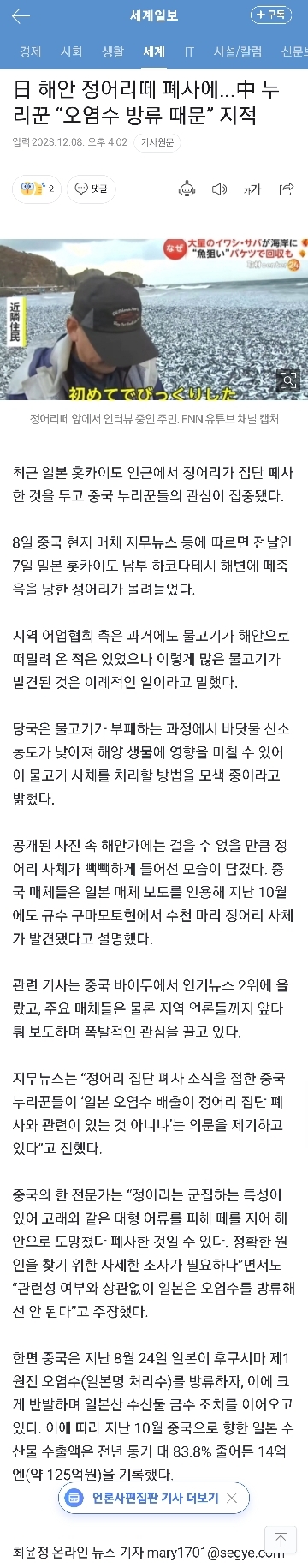 [여시뉴스데스크]日 해안 정어리떼 폐사에...中 누리꾼 “오염수 방류 때문” 지적 작성자허방재|작성시간23.12.10|조회수1,043 목록 댓글 4 글자크기 작게가 글자크기 크게가 출처 : https://naver.me/GPXGQgM日 해안 정어리떼 폐사에...中 누리꾼 “오염수 방류 때문” 지적정어리떼 앞에서 인터뷰 중인 주민. FNN 유튜브 채널 캡처 최근 일본 홋카이도 인근에서 정어리가 집단 폐사한 것을 두고 중국 누리꾼들의 관심이 집중됐다. 8일 중국 현지 매체 지무뉴스 등에 따n.news.naver.com중국은 그래도 후쿠시마 오염수에 대해 관심 많은듯 다음검색 현재 게시글 추가 기능 열기 북마크 공유하기 신고 센터로 신고 댓글 댓글 4 댓글쓰기 답글쓰기 댓글 리스트 작성자금시계방 | 작성시간 23.12.10 ㅈㄴ무서워 작성자이야호홍홍. | 작성시간 23.12.10 저걸로 젓갈액젓 소스만들까봐걱정이네 작성자환장하겐네.. | 작성시간 23.12.10 아무도 관심이 없구나.. ㅠ 작성자둠두리루 | 작성시간 23.12.11 중국아 불매 계속 해라.. 댓글 전체보기