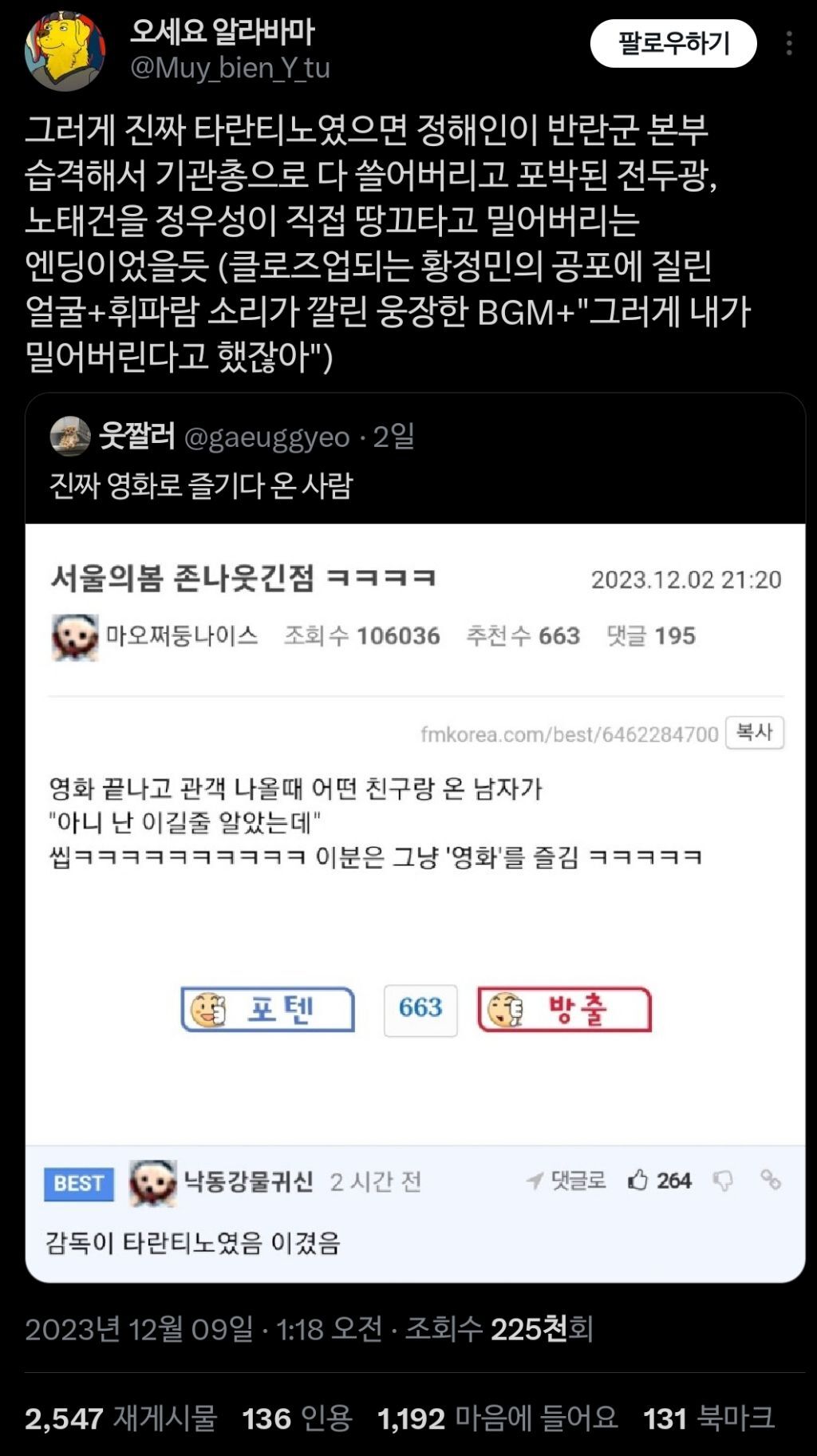 작성자뤠디오 작성시간 23.12.10 나도 그래도 영화니까 한편으로는 다 뒤집어 엎어버리는 엔딩 기대하면서 봤음....ㅠㅠㅠ