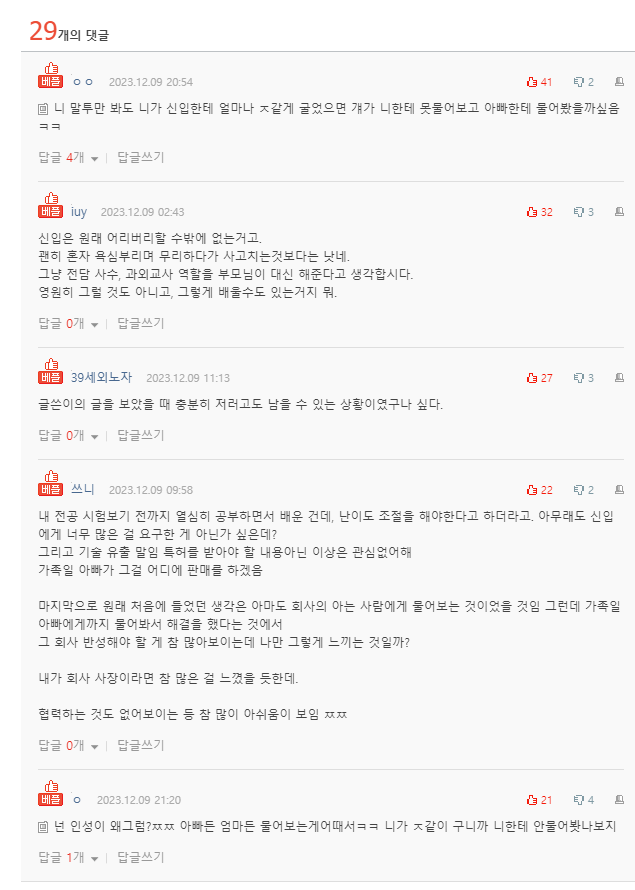 작성자반짝이는물 작성시간 23.12.10 그럼 니가 잘 좀 가르쳐줘…선배가 괜히 선배냐? 신입 얼빵하다며…세상에 똑똑한 사람만 있는 것도 아니고 어쨌든 붙어서 입사한거고 지도 잘 모르겠으니까 잘해보겠다고 그런건데…인터넷에서 욕할게 아니라 회사 일이니 가족이라도 타인에게 말하지 않는 게 좋다고 조언해 줄 수 있는 거잖아 마음을 왜 저렇게 쓰는지