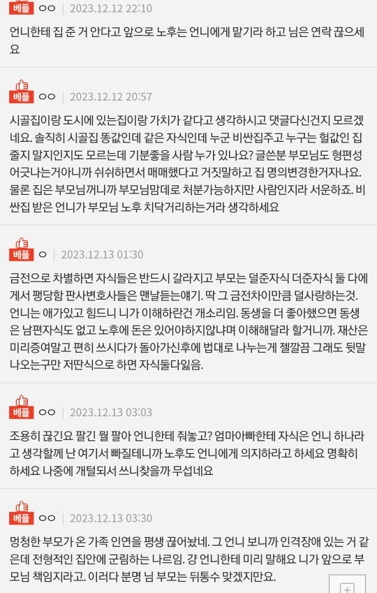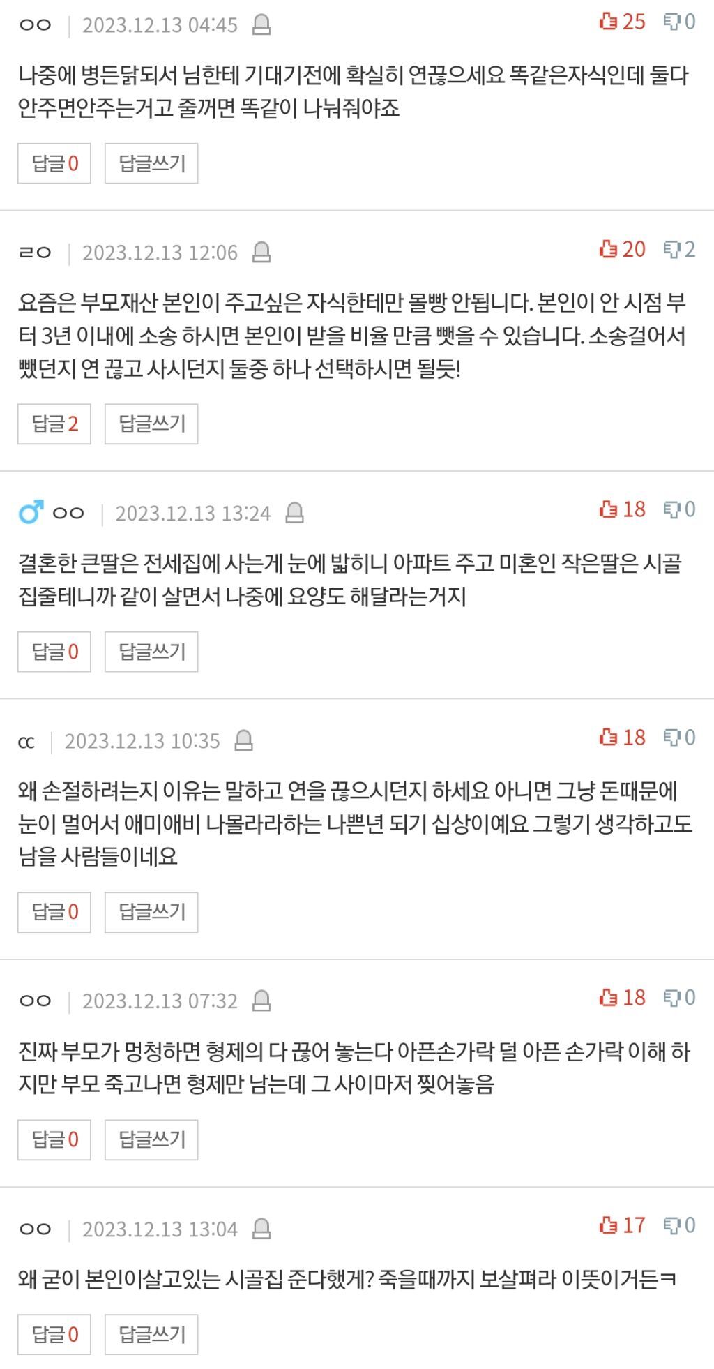 작성자인성이인성 작성시간 23.12.13 둘째 진짜 위했으면 결혼안한 둘째한테 집주던가 서울 집팔아서 반반주던가했겟지