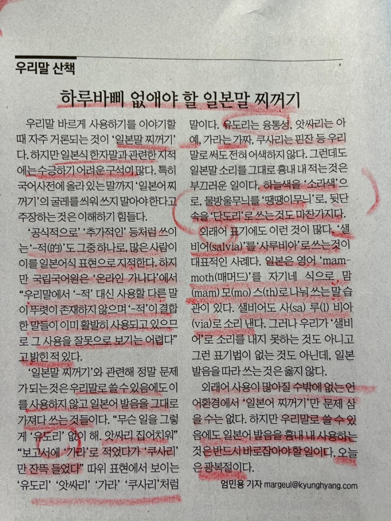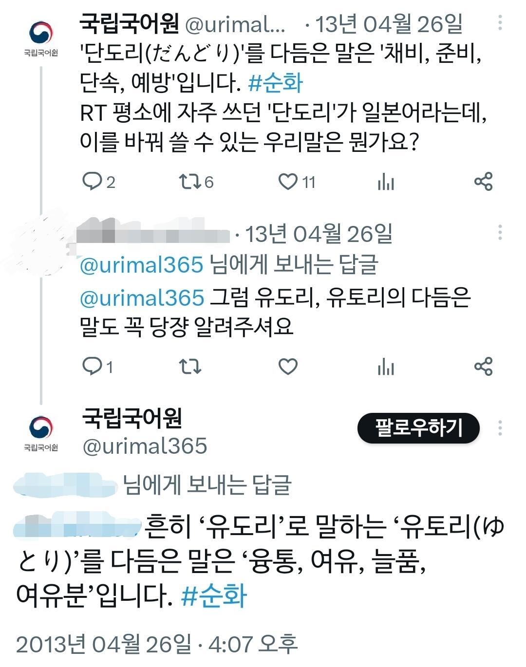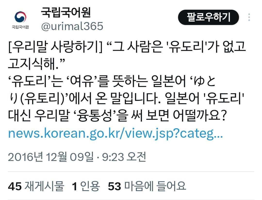 [스크랩] [흥미돋]'유도리'는 어느 나라 말일까? 우리말이다 vs 아니다 (정답 있음) 작성자달달무|작성시간23.12.14|조회수24,568 목록 댓글 25 글자크기 작게가 글자크기 크게가 ㅊㅊ https://newduck.net/board_RFNM37/60449370국립국어원에서 편찬한 표준국어대사전에서 '유도리'를 검색해봄엥???등재되어 있지 않음이게 무슨 일이고!사실 유도리는 일본어임유토리(ゆとり)에서 유래한 일본어 잔재임정답 맞힌 사람들 멋져멋져🎉🎉🎉유도리는 아무래도 일본어 잔재라서 여유, 융통(융통성) 등으로 바꿔쓰는 걸 권장함보너스. 단도리도 일본어 잔재였음 다음검색 스크랩 원문 : 쭉빵카페 현재 게시글 추가 기능 열기 북마크 공유하기 신고 센터로 신고 댓글 댓글 25 댓글쓰기 답글쓰기 댓글 리스트 작성자인생사 새옹심이 | 작성시간 23.12.14 와 개많네 작성자파타타스 브라바스 | 작성시간 23.12.14 맘모스는 충격이네… 작성자클라우디 | 작성시간 23.12.14 그래서 닭도리탕은 뭐냐고 알려 달라고 ㅠㅠ 답댓글 작성자손이시려꽁 | 작성시간 23.12.14 닭볶음탕?? 답댓글 작성자클라우디 | 작성시간 23.12.14 그것도 아니라며ㅠㅠ 말안된다며ㅠㅠ 댓글 전체보기