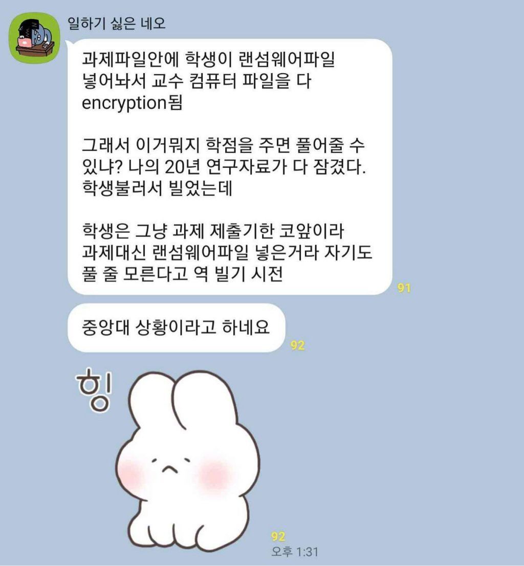 [스크랩] [흥미돋]중앙대 랜섬웨어 사건 작성자다음카페(Daum)|작성시간23.12.14|조회수10,504 목록 댓글 26 글자크기 작게가 글자크기 크게가 다음검색 스크랩 원문 : 도탁스 (DOTAX) 현재 게시글 추가 기능 열기 북마크 공유하기 신고 센터로 신고 댓글 댓글 26 댓글쓰기 답글쓰기 댓글 리스트 작성자김 희성 | 작성시간 23.12.14 이거 주작이에요. ㅠ 작성자냉면사리 | 작성시간 23.12.14 미친놈아녀 작성자찰푸헴 | 작성시간 23.12.14 퇴학 가자 작성자배기성씨 | 작성시간 23.12.14 와 랜섬웨어를;;; 간땡이 대애단하네 작성자델룩 | 작성시간 23.12.14 냄져지 ? 댓글 전체보기