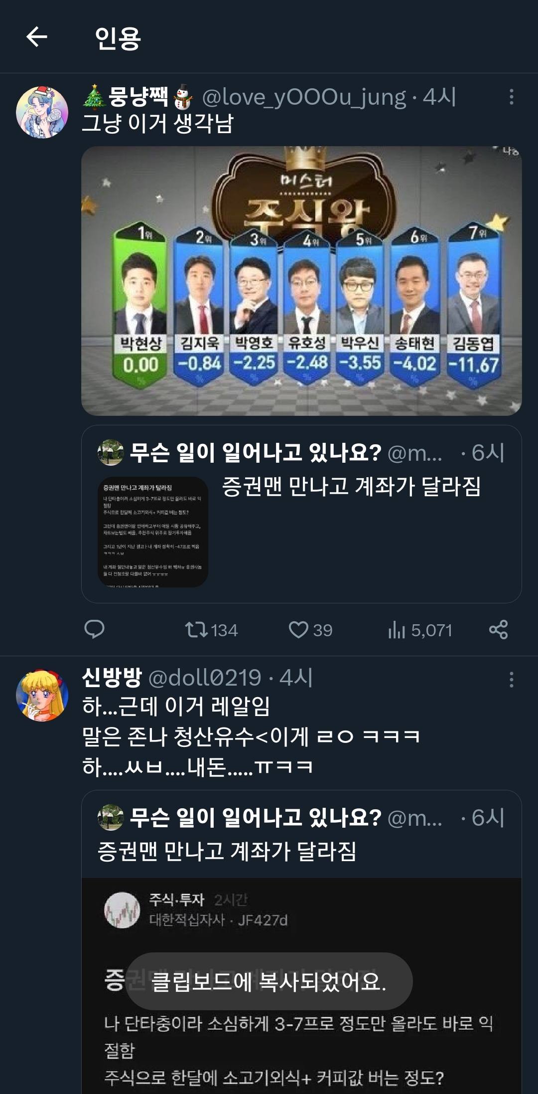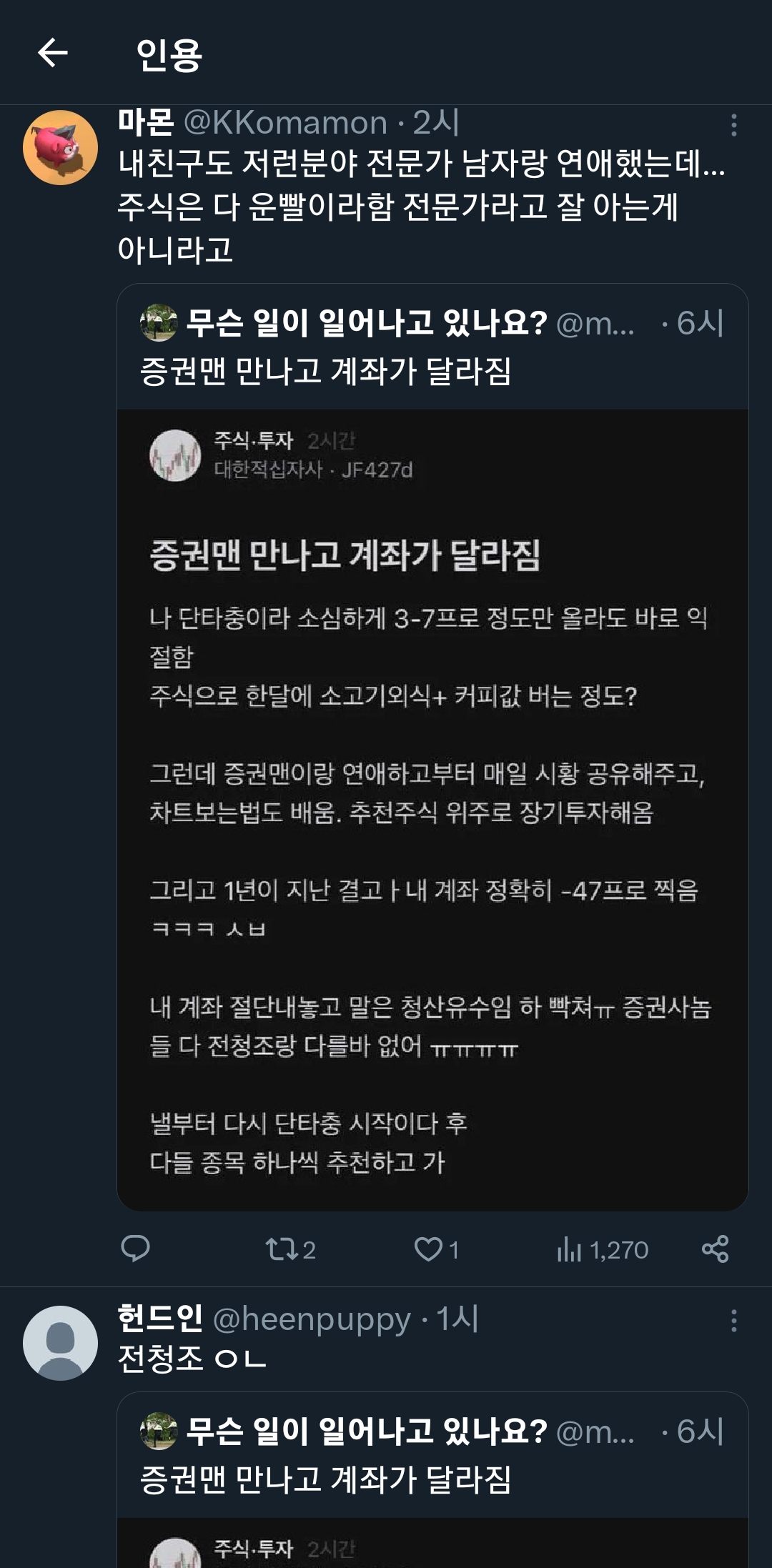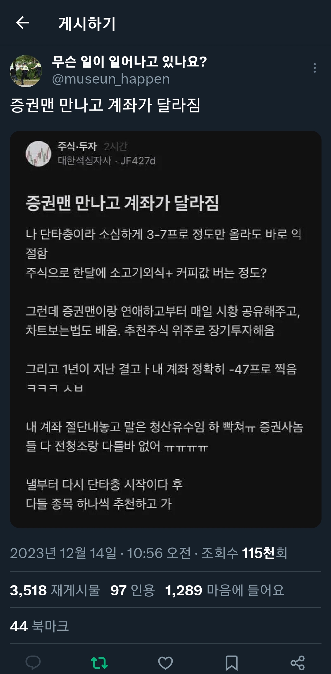 [흥미돋]증권맨 만나고 계좌가 달라짐 작성자뿔링쿠|작성시간23.12.15|조회수12,899 목록 댓글 16 글자크기 작게가 글자크기 크게가 출처 : 여성시대 뿔링쿠https://twitter.com/museun_happen/status/1735116520836268207?t=w2FWRi0eUPPPc1QaO4h5Og&s=19X의 무슨 일이 일어나고 있나요?님(@museun_happen)증권맨 만나고 계좌가 달라짐twitter.com 다음검색 현재 게시글 추가 기능 열기 북마크 공유하기 신고 센터로 신고 댓글 댓글 16 댓글쓰기 답글쓰기 댓글 리스트 작성자Ellen Ripley | 작성시간 23.12.15 전청좈ㅋㅋㅋㅋㅋㅋㅋㅋ 작성자명작끌올하는여시 | 작성시간 23.12.15 저사람 원래 수익률 좋은데 ..? 어케한거지 부럽다 작성자호롤롤로로로롤로롤로 | 작성시간 23.12.15 전청좈ㅋㅋㅋㅋㅋㅋㅋㅋ 작성자유알로랄 | 작성시간 23.12.15 에이 ㅋㅋ 주식도 여자들이 잘한다더라 작성자모델로 | 작성시간 23.12.15 와 ㅅㅂ ㅇㄱㄹㅇ임 전남충 증권맨 전청조마냥 입 존나 잘터는데 결국 내 계좌는.. 댓글 전체보기