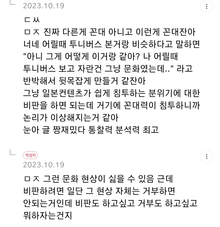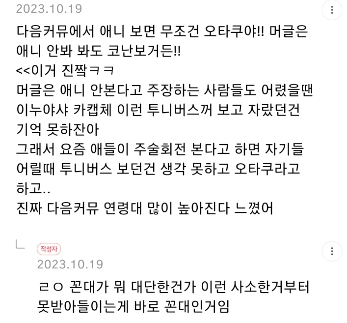 이런 류의 논쟁이 종종 보이는데 나도 처음엔 그냥 투디 보면 오타쿠지 뭐.. 굳이 찐타쿠 부심 부리면서 싸워야하나?라고 생각했다가 중고딩들이랑 같이 있는 시간이 좀 생기면서 생각이 바뀜