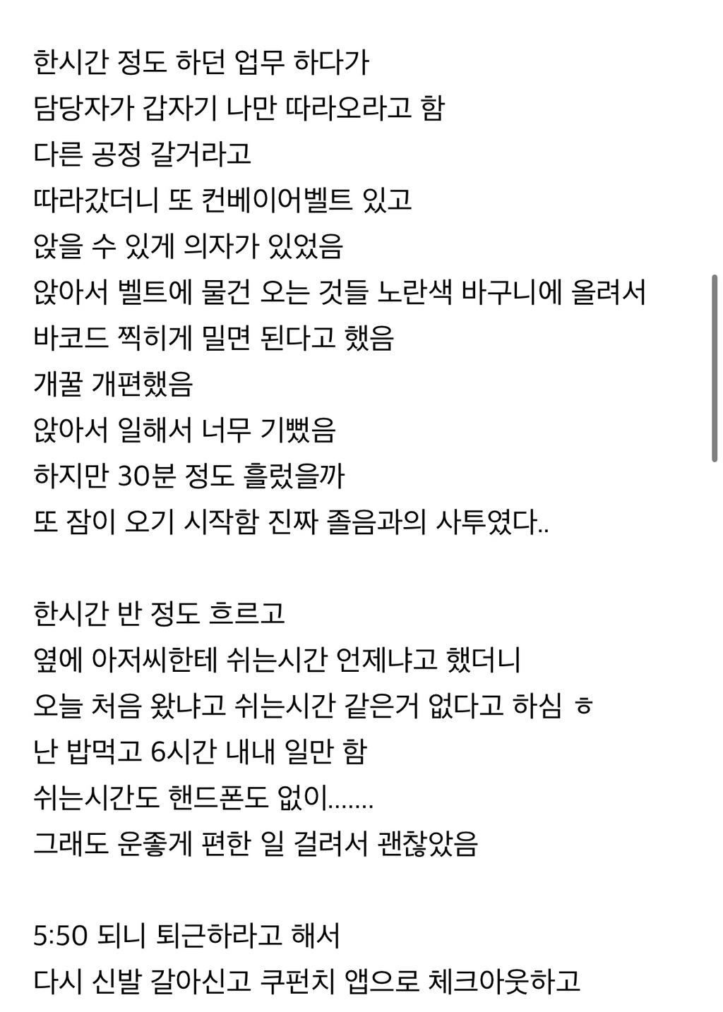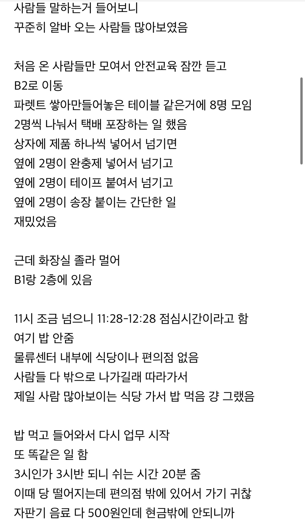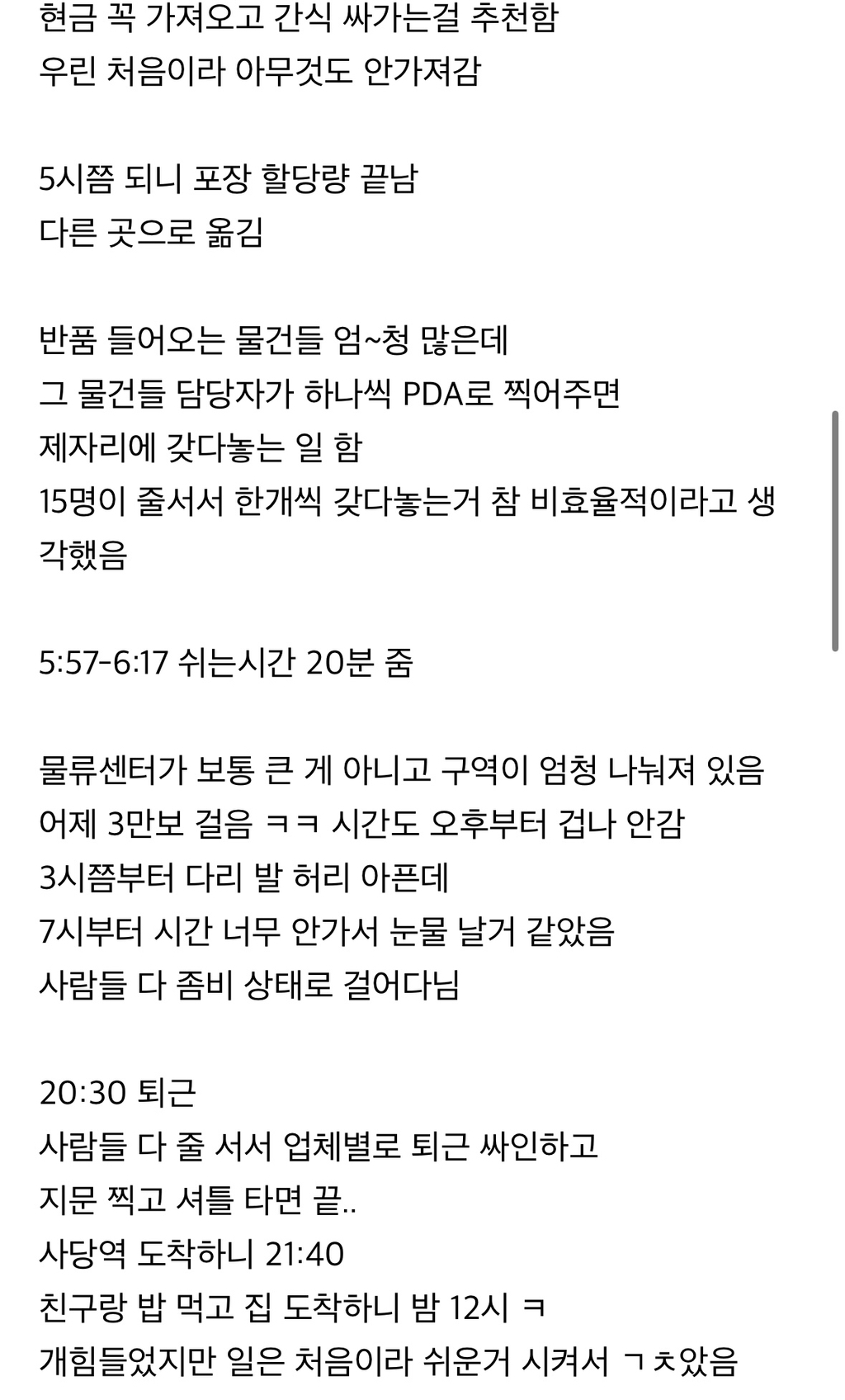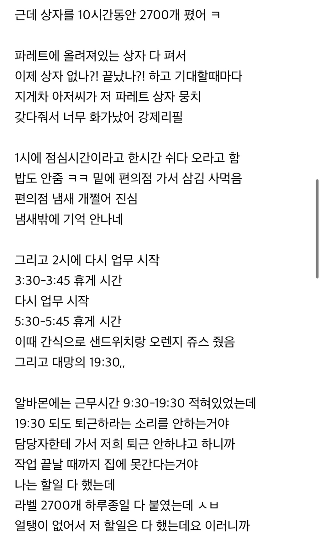 이날도 택배 포장하고 4시간 일하고 1시간 쉬고 와서
