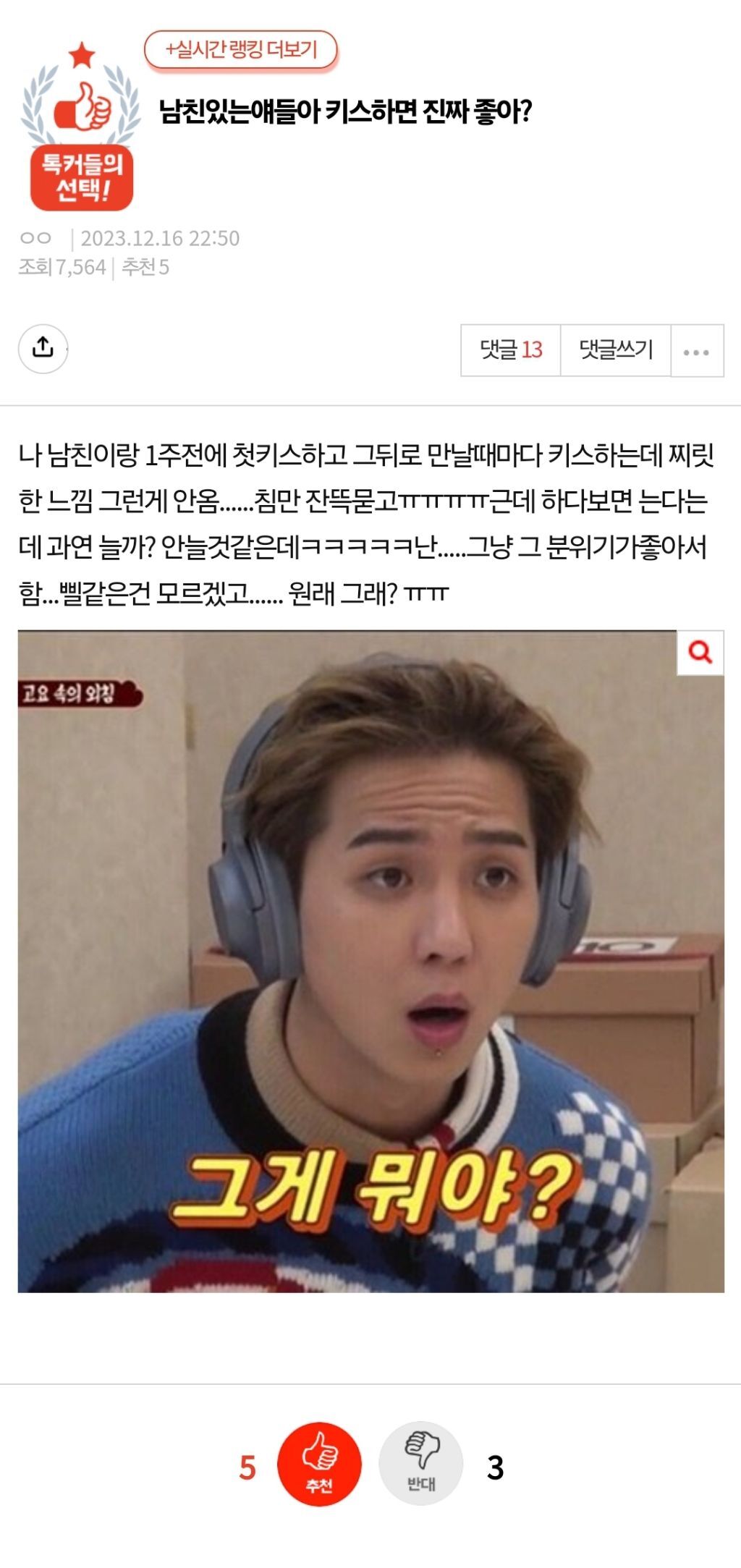 [기타]남친있는얘들아 키스하면 진짜 좋아? 작성자zkzlalqq|작성시간23.12.17|조회수18,957 목록 댓글 53 글자크기 작게가 글자크기 크게가 출처 : https://m.pann.nate.com/talk/371630015?currMenu=search&page=1&q=%EB%82%A8%EC%B9%9C 다음검색 현재 게시글 추가 기능 열기 북마크 공유하기 신고 센터로 신고 댓글 댓글 53 댓글쓰기 답글쓰기 댓글 리스트 작성자당군악 | 작성시간 23.12.17 잘하면 좋음못하면 진짜 정떨어져 작성자나의 바다 | 작성시간 23.12.17 남자랑 한 키스는 좋았던적이 없음. 여자랑은 대부분 좋았어 부드럽고 말랑하고 작성자침묵의교실 | 작성시간 23.12.17 못해서 그런거 같은데 ㅎㅎㅎ 나도 할때마다 좋아~ 작성자비쵻비 | 작성시간 23.12.17 키스 진짜 잘하는 놈이랑 래보고싶다 작성자플로리다프로젝트 | 작성시간 23.12.17 난 잘생기고 잘하는 애랑 하니까 좋았음 댓글 전체보기