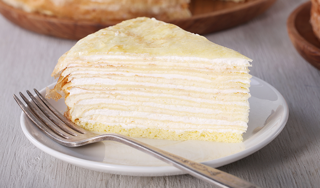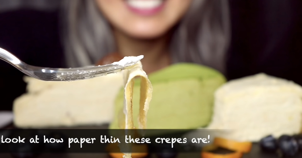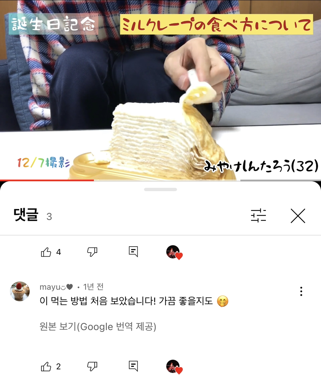 "알고계신가요? 한국분들은 크레이프 케이크를 먹을 때 위에서부터 한겹씩 벗겨먹어요!" 라고 소개함