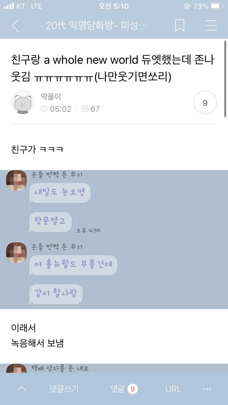 [스크랩] [배꼽의행방][익웃] 친구랑 a whole new world 듀엣했는데 존나웃김 ㅠㅠㅠㅠㅠㅠ(나만웃기면쏘리)