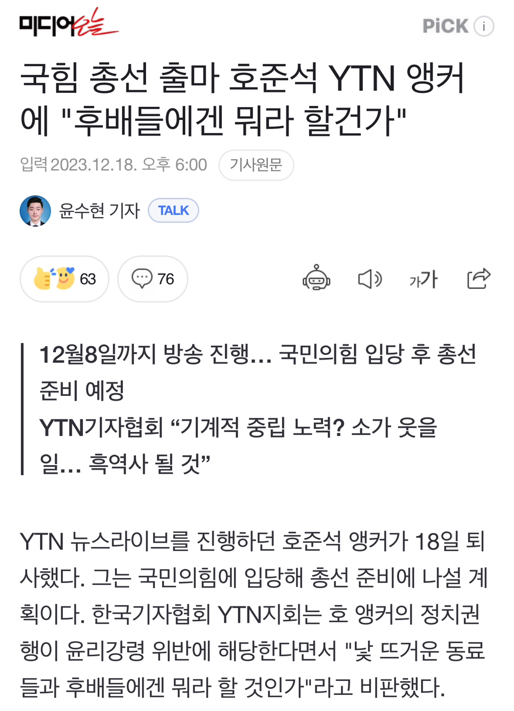 [여시뉴스데스크]국힘 총선 출마 호준석 YTN 앵커에 "후배들에겐 뭐라 할건가" 작성자소리앙|작성시간23.12.19|조회수957 목록 댓글 1 글자크기 작게가 글자크기 크게가 출처 : https://naver.me/5pH6hDvx국힘 총선 출마 호준석 YTN 앵커에 "후배들에겐 뭐라 할건가"YTN 뉴스라이브를 진행하던 호준석 앵커가 18일 퇴사했다. 그는 국민의힘에 입당해 총선 준비에 나설 계획이다. 한국기자협회 YTN지회는 호 앵커의 정치권행이 윤리강령 위반에 해당한다면서 "낯 n.news.naver.com전문출처 다음검색 현재 게시글 추가 기능 열기 북마크 공유하기 신고 센터로 신고 댓글 댓글 1 댓글쓰기 답글쓰기 댓글 리스트 작성자이재명 지킴이 | 작성시간 23.12.19 ㅋㅋㅋㅋ쪽팔린줄 알아라 댓글 전체보기