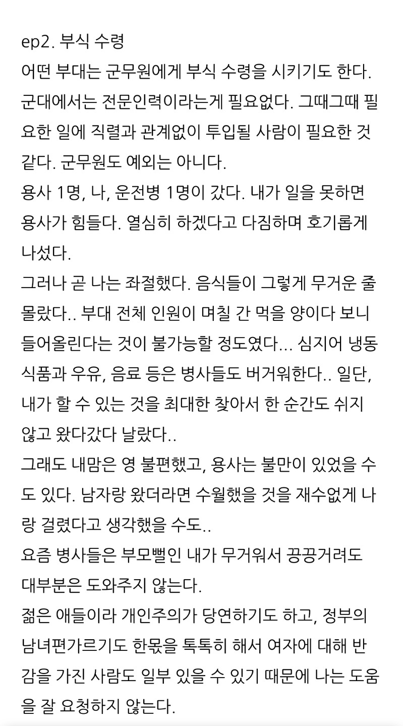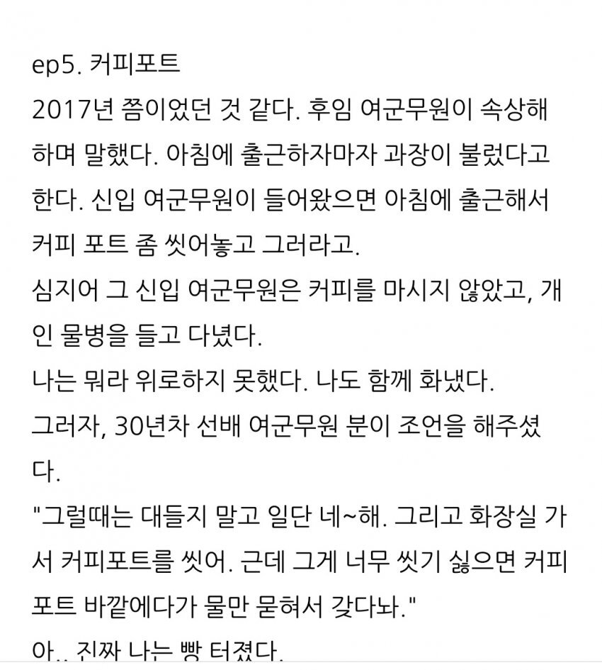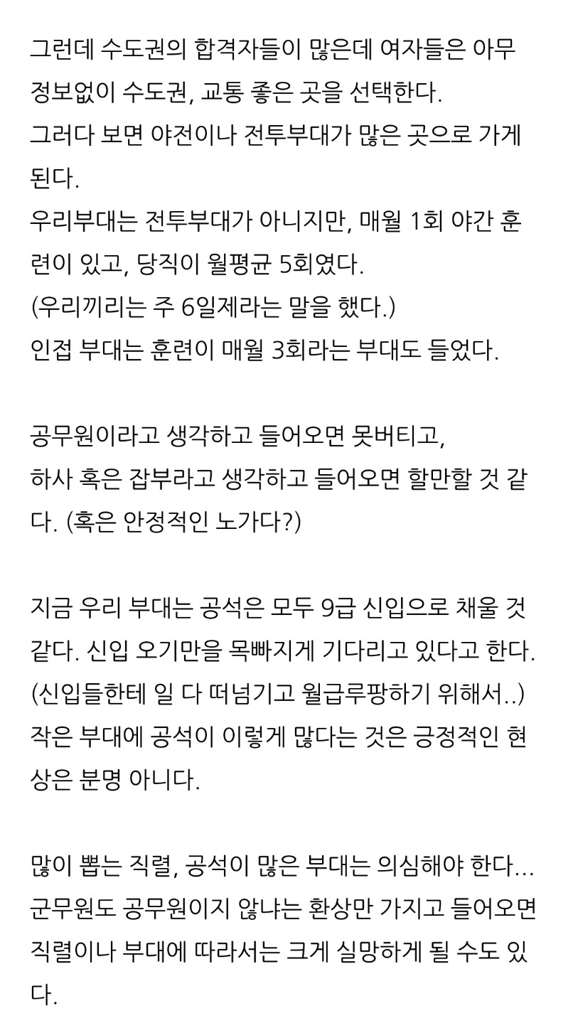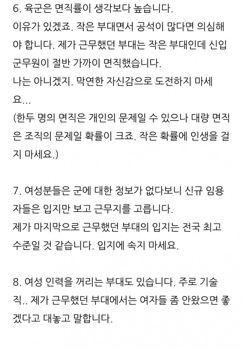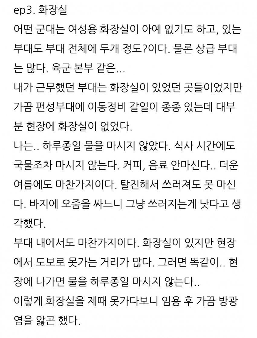 작성자빨래하기전에주머니를꼭확인합시다 작성시간 23.12.19 생리대 챙겨서 집가서 버려야하고^^... 내 친구는 당직 서는 곳에 여자화장실 없어서 그날은 최대한 물 안마시고 밤새 참음ㅋ.. 여기까진 극남초니 시설상 그렇다 쳐, 군대니까 지역이나 시설 환경 개후진거 그렇다 쳐, 근데 마인드가 문제임 걍ㅋㅋㅋ 여자 싫어서 안받으려고 지들끼리 싸움ㅋㅋ 차라리 폐급 남자를 받고 말지라는 마인드임ㅋㅋㅋ 다른 팀 여자는 인사만 잘해도 성격 좋니 마니 일을 잘하니 마니 앞에서는 칭찬 구구절절해도 자기 팀에 두는건 싫어함ㅋㅋ 뒷담화는 뭐~ 의외로가 아니라 그냥 대놓고 심함ㅋㅋ 여자든 남자든.. 여자들끼리 힘내자 뭉치자 하고 갔는데 나만 그래서 그게 안되더라.. 남자들 신입오면 몸평 얼평 기본이고 옷 하나하나까지 평가함ㅋㅋㅋㅋ 나는 모르는 사람들이 이미 날 뒤에서 다 평가하고 있는 곳^^ 성희롱은 뭐 당연하고~ ^^