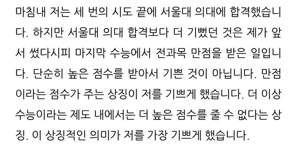 그리고 같은 인터뷰에서 “수능만점=더 이상 수능이라는 제도 내에서는 더 높은 점수를 줄 수 없다는 상징” 이라는 명언 투척..