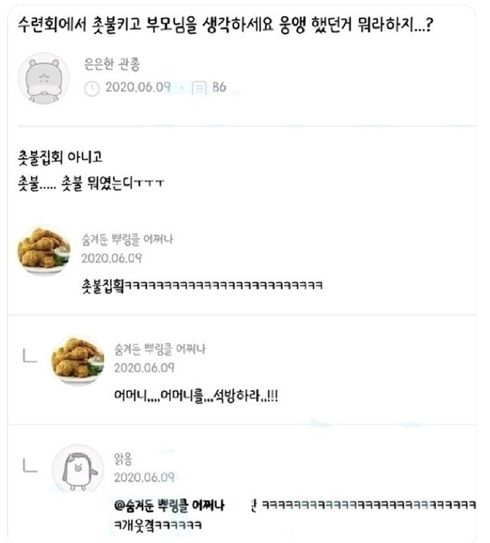 [흥미돋]수련회에서 촛불 들고 부모님을 생각하세요 했던 거 뭐라하지? 작성자나승현|작성시간23.12.21|조회수4,728 목록 댓글 14 글자크기 작게가 글자크기 크게가 출처 : https://www.instagram.com/p/C1DrfWKph5J/?igsh=c2RwMHRyZ2Nod3Mx 다음검색 현재 게시글 추가 기능 열기 북마크 공유하기 신고 센터로 신고 댓글 댓글 14 댓글쓰기 답글쓰기 댓글 리스트 작성자마룽 하이롱 | 작성시간 23.12.21 촛불의식 ㅋㅋㅋㅋㅋ 작성자망그라진곰 | 작성시간 23.12.21 촛불의식ㅋㅋㅋ 작성자갓생살날온다 | 작성시간 23.12.21 캠프파이어 작성자필리스 | 작성시간 23.12.21 어…어머니를…석방하라…!!!0 답댓글 작성자뽀송맘 | 작성시간 23.12.21 ㅋㅋㅋㅋㅋㅋㅋㅋㅋㅋㅋㅋㅋㅋㅋㅋㅋㅋㅋㅋㅋㅌ 댓글 전체보기