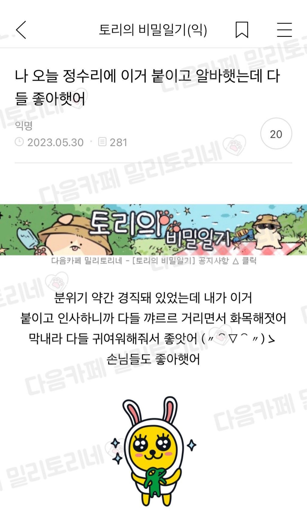 [흥미돋]나 오늘 정수리에 이거 붙이고 알바했는데 다들 좋아했어 작성자전상현|작성시간23.12.21|조회수153,549 목록 댓글 56 글자크기 작게가 글자크기 크게가 출처 : 여성시대 전상현https://twitter.com/milytoryfan/status/1737751471125569600?t=mxSUwFN9G4ktNaqhL6eEFw&s=19 다음검색 현재 게시글 추가 기능 열기 북마크 공유하기 신고 센터로 신고 댓글 댓글 56 댓글쓰기 답글쓰기 댓글 리스트 답댓글 작성자뚜둔!!! | 작성시간 23.12.30 댓글 따뜻하다♡ 작성자딥치즈 베이컨 포테이토 | 작성시간 23.12.26 밀토는 다 귀여워🧡 작성자비스코티 | 작성시간 23.12.28 다정하다 다정해 ㅎㅎ 작성자떠껀한 | 작성시간 23.12.28 너무 귀여워.. 작성자ahiqizjjssg | 작성시간 23.12.31 아귀여워 댓글 전체보기