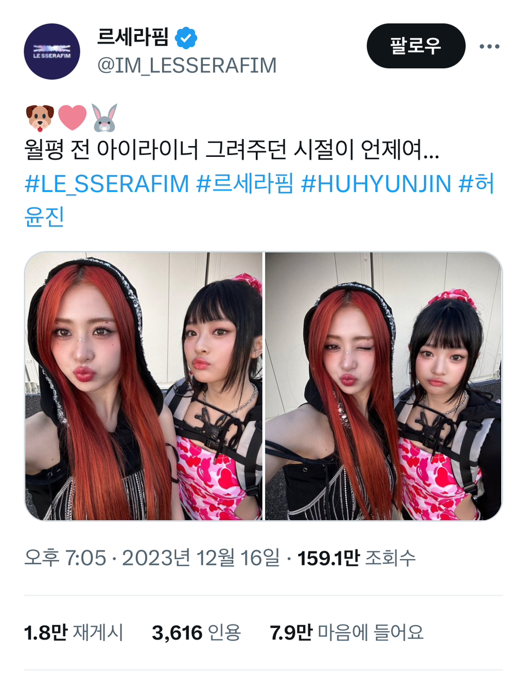 [흥미돋]르세라핌 허윤진과 뉴진스 하니 의외의 관계성 작성자운행정보|작성시간23.12.21|조회수15,266 목록 댓글 13 글자크기 작게가 글자크기 크게가 출처 : 여성시대 운행정보최근 올라온 윤진이와 하니의 숏츠비즈니스치고는 너무 친해보여서 찾아봤는데핫걸이 된 에리얼과 팜넬로피뉴진스 하니의 애정넘치는 언급+ 둘이 이미 바비 영화 보러갔다 왔다고 함둘이 연습생 시절 아이라인도 서로 그려줬다고 함데뷔후 인생네컷까지ㅋㅋㅋㅋㅋㅋㅋㅋㅋㅋㅋㅋ진짜 의외의 관계성... 맛집이네요^^ 다음검색 현재 게시글 추가 기능 열기 북마크 공유하기 신고 센터로 신고 댓글 댓글 13 댓글쓰기 답글쓰기 댓글 리스트 작성자님냄님냄 | 작성시간 23.12.21 둘다 졸라게 귀엽고 무해해... 작성자달퐁임 | 작성시간 23.12.21 4세대 친목 넘 재밌엌ㅋㅋㅋ 작성자오오오오오오오진짜 | 작성시간 23.12.21 헐랭💕💕💕 작성자믹스견보호자 | 작성시간 23.12.21 둘이 노는 날 라이브 한번 해주라.. 작성자BEABABOOBEE | 작성시간 23.12.22 바비 말고 다른 영화 또 같이 보러 감 댓글 전체보기