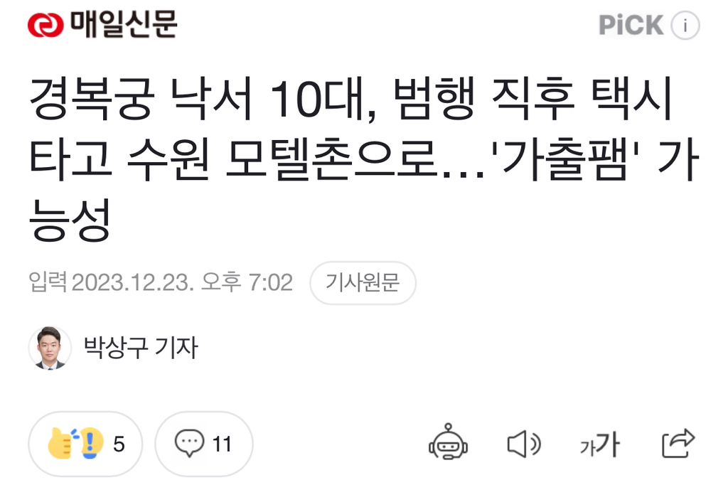서울 경복궁에 낙서를 한 10대들이 범행 후 경기 수원시 팔달구 매산동의 모텔촌으로 이동한 것으로 드러났다. 이들은 택시비로 낼 돈이 없어 목적지에 도착한 뒤 또래에게 급히 돈을 빌려 택시비를 지불하고는 모텔촌에 머문 것으로 알려졌다. 이를 두고 일각에서는 이들이 소위 '가출팸'으로 범죄를 저질렀을 가능성이 높다고 주장하고 있다.