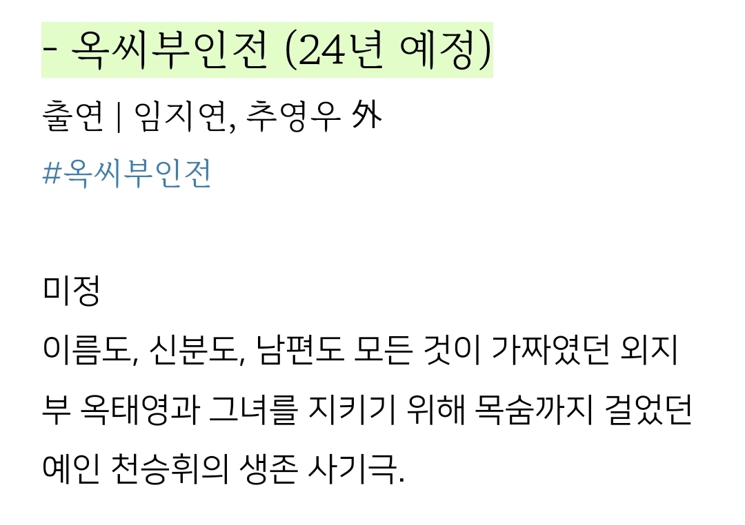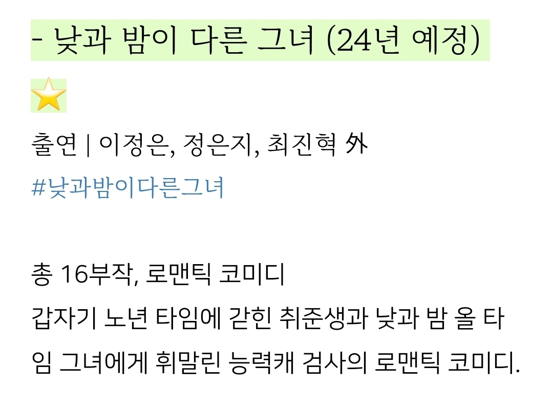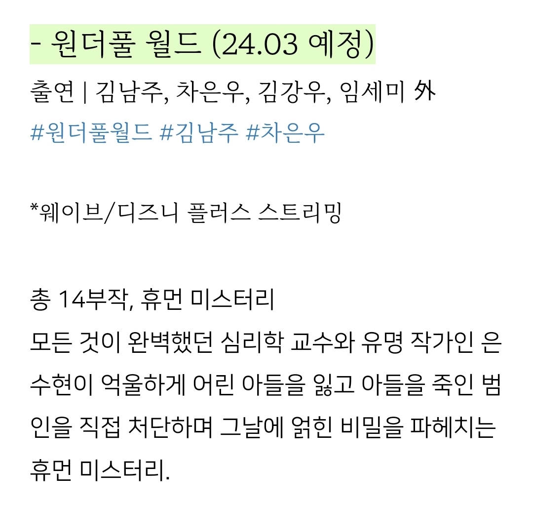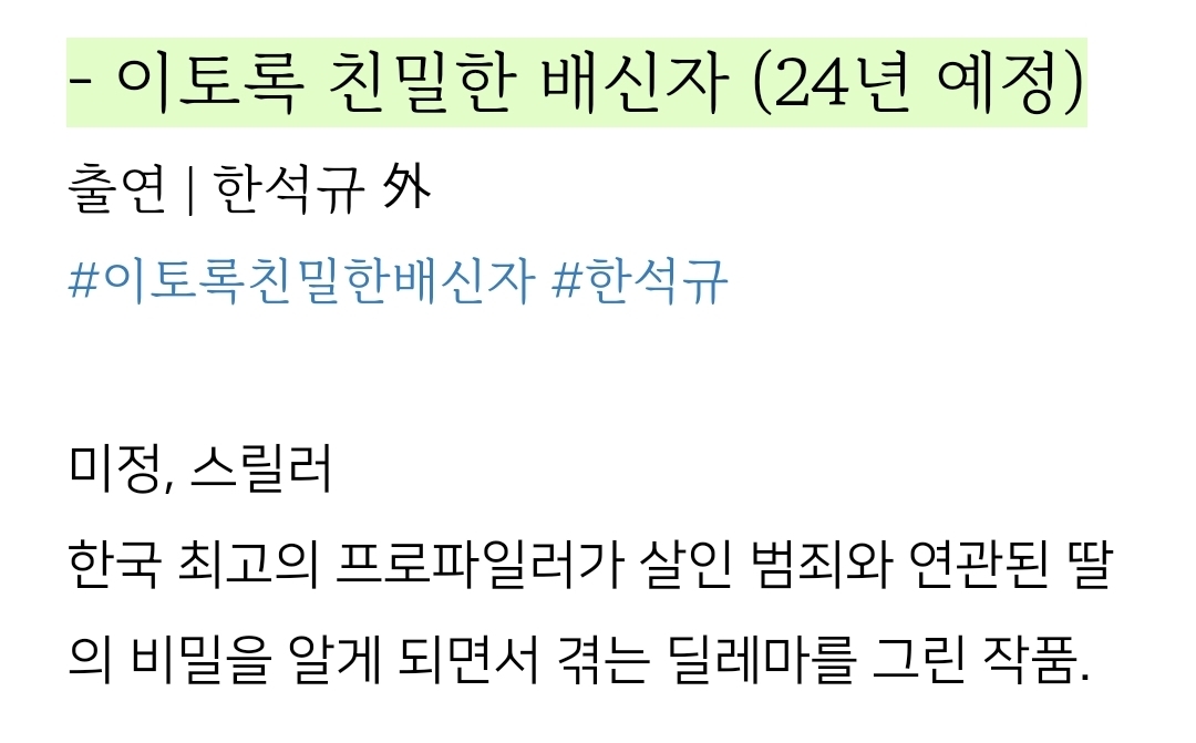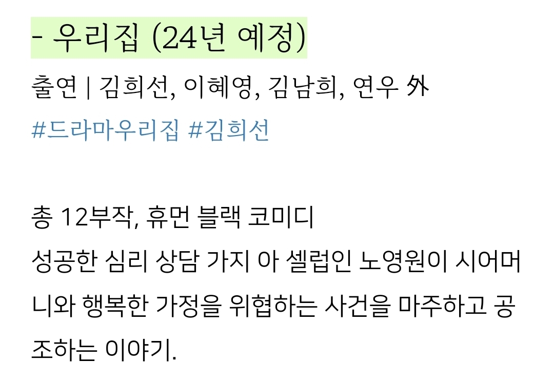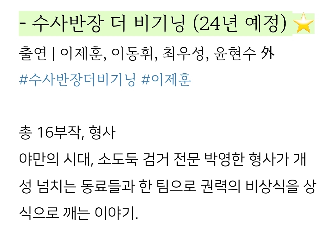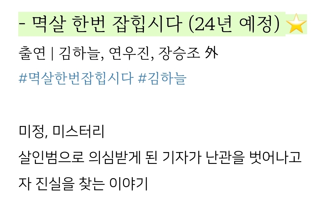 [흥미돋]2024 방영예정 한국 드라마 라인업(mbc/sbs/kbs/tvn/ jtbc) 작성자고슴도치의스컬|작성시간23.12.29|조회수1,902 목록 댓글 1 글자크기 작게가 글자크기 크게가 출처 : https://naver.me/xq52C0L7여성시대 고슴도치의 스컬MBCSBSKBSJTBCtvN 다음검색 현재 게시글 추가 기능 열기 북마크 공유하기 신고 센터로 신고 댓글 댓글 1 댓글쓰기 답글쓰기 댓글 리스트 작성자모조리 먹고싶다 | 작성시간 23.12.29 오 김하늘 장승조 연우진 재밌으려나 댓글 전체보기