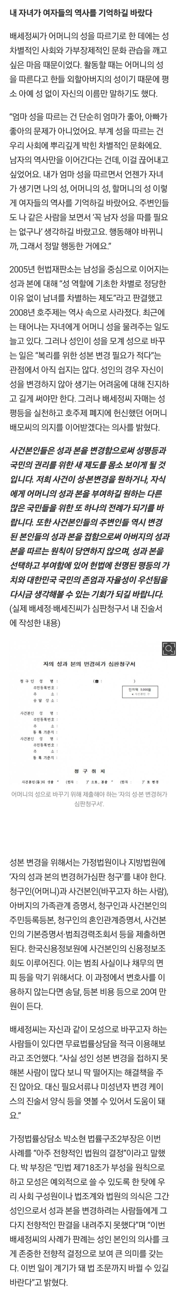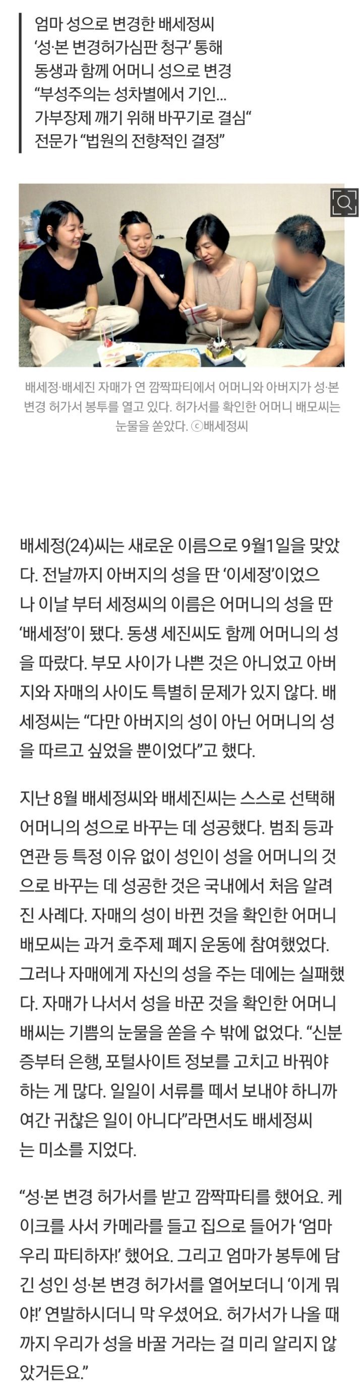 [스크랩] [여시뉴스데스크]“저는 어머니의 성을 선택했습니다”… 부성우선주의에 제동 건 자매 작성자racker|작성시간23.12.29|조회수1,157 목록 댓글 3 글자크기 작게가 글자크기 크게가 출처 : http://www.womennews.co.kr/news/articleView.html?idxno=203530“저는 어머니의 성을 선택했습니다”… 부성우선주의에 제동 건 자매 - 여성신문배세정(24)씨는 새로운 이름으로 9월1일을 맞았다. 전날까지 세정씨의 이름은 ‘이세정’으로 아버지 이씨의 성을 딴 이름이었다. 9월1일부터 세정씨의 이름은 어머니의 성을 딴 ‘배세정’이 됐www.womennews.co.kr...전문은 출처로 다음검색 스크랩 원문 : 비공개카페 현재 게시글 추가 기능 열기 북마크 공유하기 신고 센터로 신고 댓글 댓글 3 댓글쓰기 답글쓰기 댓글 리스트 작성자호요요요들아 | 작성시간 23.12.29 와 이렇게 행동하는 분들 ㄹㄹ 개멋있다 bbbb 작성자이게결말이라고 | 작성시간 23.12.29 나도 바꾸고싶다..부모님 성이 같은게 슬프네 ㅠ 작성자집에보내쥬 | 작성시간 23.12.29 아부지만 모자이크한거 왤케 웃곀ㅋㅋㅋㅋㅋㅋㅋㅋㅋㅋ 댓글 전체보기