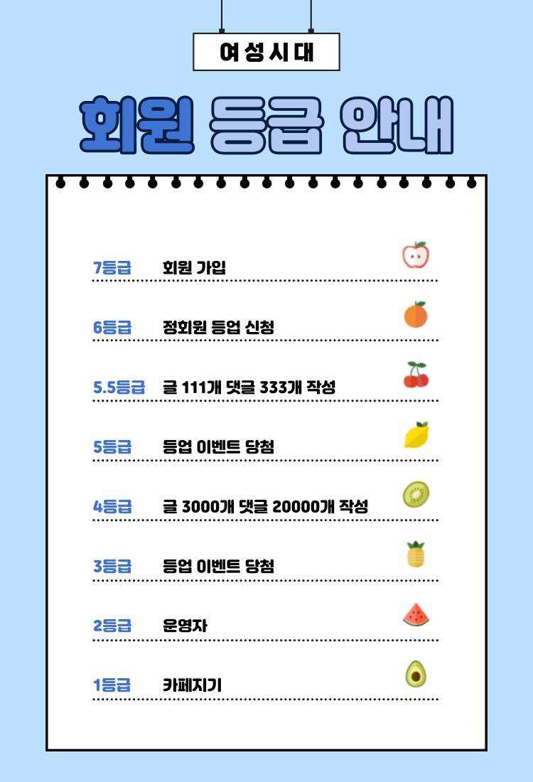 [흥미돋]여시 등업 기준 🍎🍊🍒🍋🥝🍍🍉🥑 작성자에일ㄹㅣ언|작성시간24.01.07|조회수24,919 목록 댓글 256 글자크기 작게가 글자크기 크게가 출처 : 여성시대 에일ㄹㅣ언7~5.5 까지는 쉬움글 111개 댓글 333개 대부분 카페처럼방문일수 조건 ❌ / 하루 글 수 제한 ❌but4등급이상 ~ 1등급되기는 매우 어렵다 다음검색 현재 게시글 추가 기능 열기 북마크 공유하기 신고 센터로 신고 댓글 댓글 256 댓글쓰기 답글쓰기 댓글 리스트 작성자똥맛카레vs똥구멍맛카레 | 작성시간 24.01.07 죽기전에 5등급 될수 있냐고 작성자근로자A | 작성시간 24.01.08 나도 레몬달고싶다 작성자소방서옆경찰청창살쇠창살 | 작성시간 24.01.08 글 삼천개 넘나 어렵다죠ㅠ 작성자조한결 | 작성시간 24.01.09 저기요 5등급 언제 열어줘요 작성자T발놈 | 작성시간 24.01.10 댓글은 찼는데 게시글 삼천개는ㅠ 댓글 전체보기