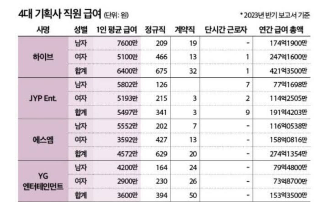 [기타]4대 기획사 직원 급여 작성자나승현|작성시간24.01.07|조회수16,910 목록 댓글 59 글자크기 작게가 글자크기 크게가 출처 : 여성시대, 나승현하이브 2,500만 차이제와피 609만 차이에스엠 1,960만 차이와이지 1,300만 차이하이브 도랏나... 다음검색 현재 게시글 추가 기능 열기 북마크 공유하기 신고 센터로 신고 댓글 댓글 59 댓글쓰기 답글쓰기 댓글 리스트 작성자고흐려그란전쟁 | 작성시간 24.01.07 하이브는…고연봉 남자임원이 많을삘….. 답댓글 작성자1101회로또1등당첨자 | 작성시간 24.01.07 2.. 작성자감주먹은고양이 | 작성시간 24.01.07 yg 평균급여가 2900만이면 여자는 다 최저시급따리 주는 거임...? 작성자셜록홀즈 | 작성시간 24.01.07 한남이랑 여자랑 정규직 급여차이봐 시발놈들아 작성자장우영이 | 작성시간 24.01.08 근데 생각보다 연봉 적네 댓글 전체보기