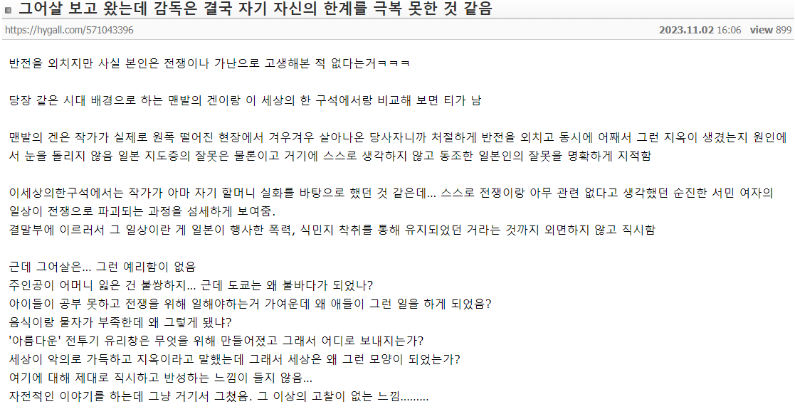 배경은 히로시마고 원폭 피해자였던 작가 외할머니 실화 바탕으로 그린 만화다. 개붕적으로 원작 작가가 여자분이라 여캐 묘사 사람 같이 하고 주인공이 꿈도 있고 사랑도 하고 평범하게 먹고 살아가려는 일상 담아내려고 한거에서 먹먹했음(멘발의 겐 영향 받았다고 하더라)