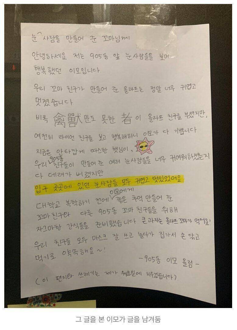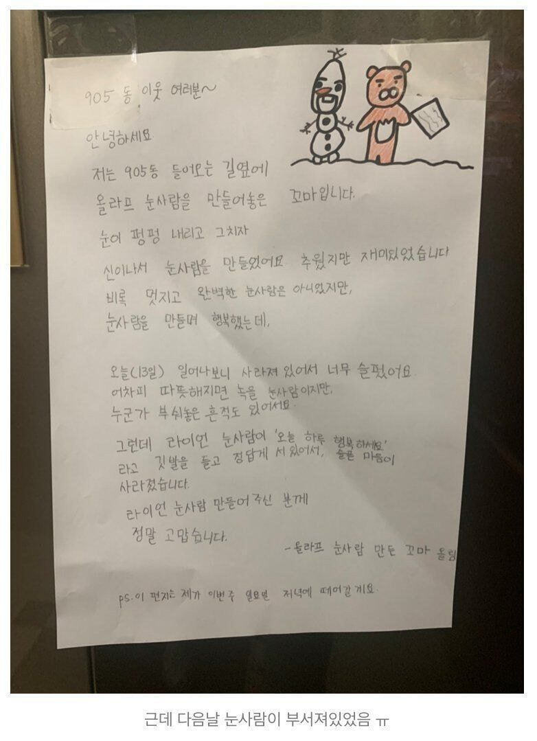 작성자아마레티 작성시간 24.01.11 처음에 이해 잘 안 가서 두 번 읽음 꼬마가 만든 건 올라프 눈사람이고 저 사진에 있는 라이언 눈사람은 다른 사람이 만든 거고 고맙다는 것 같은데