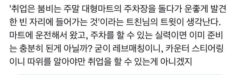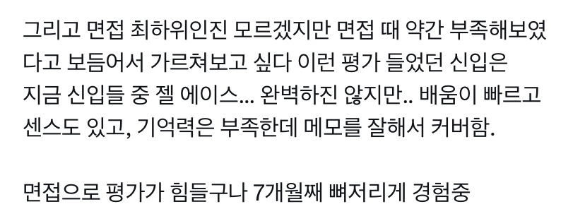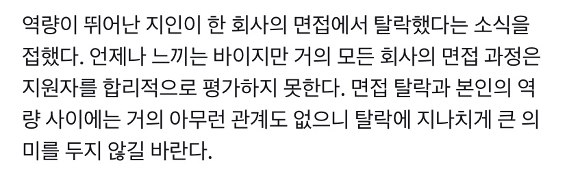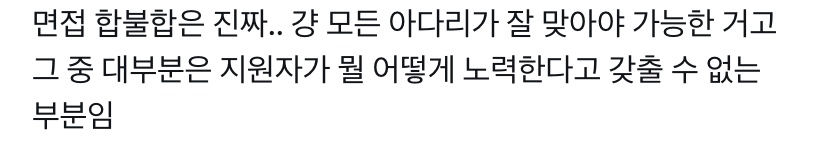 “면접 합불합은 진짜.. 걍 모든 아다리가 잘 맞아야 가능한 거고 그 중 대부분은 지원자가 뭘 어떻게 노력한다고 갖출 수 없는 부분임”