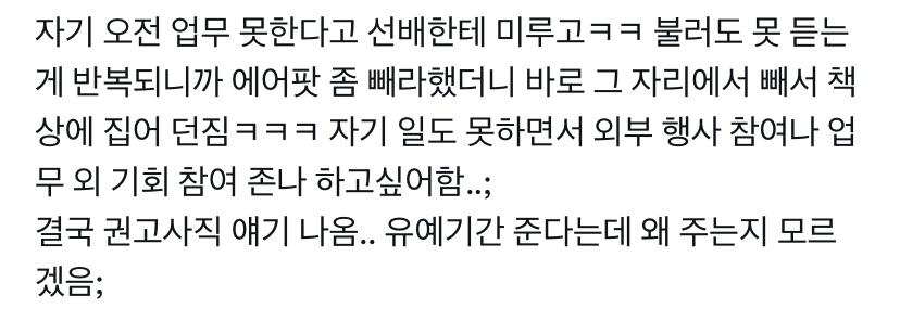작성자아야어여오요우유우이 작성시간 24.01.14 찐으로 걍 운일 때 많음ㅋㅋ 타팀 팀장 진짜 맘에 들어한 사람 갑자기 사장이 그 팀 두 명은 안 된다 그래서 불합 통보함 / 울 팀 난 뽑을 생각 없던 인턴 내가 퇴사 맘 먹고 질러서 팀장이 뽑음ㅋㅋㅋㅋㅋㅋ 사람 일 알 수가 없다…