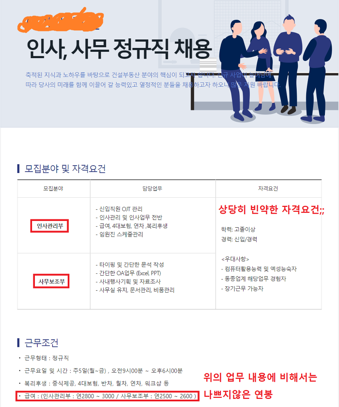 1. 사무보조/인사관리 등 비교적 업무 난이도가 낮고 특별한 자격요건 없이도 가능한 일인데 연봉은 다소 높음.