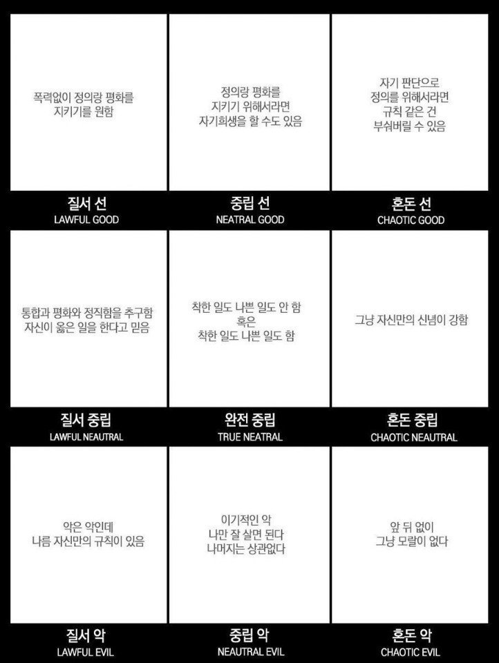 작성시간24.01.15조회수15,795 목록 댓글 16질서 선 중립 선 혼돈 선