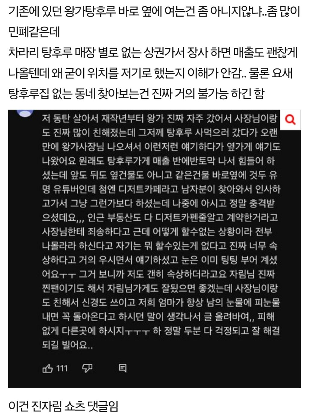 [흥미돋]옆가게와 동일업종으로 개업한 유튜버 진자림 작성자샤덴프로이데|작성시간24.01.16|조회수90,405 목록 댓글 729 글자크기 작게가 글자크기 크게가 출처 : 여성시대 샤덴프로이데67만 유튜버 진자림탕후루를 엄청 좋아해서 탕후루 가게를 열게 되었다고 함탕후루 집 바로 옆에 탕후루집 개업한다고현재 개업 준비 마친 상태라고 함문제 시 삭제 다음검색 현재 게시글 추가 기능 열기 북마크 공유하기 신고 센터로 신고 댓글 댓글 729 댓글쓰기 답글쓰기 댓글 리스트 작성자슛 좋아지는 음이온 팔찌 | 작성시간 24.01.22 정신나간듯 작성자굴포천 | 작성시간 24.01.26 누군데 존나 개념없노 작성자네임펜으로찍 | 작성시간 24.01.26 저건 상도가 아니지 작성자헬리 | 작성시간 24.01.27 다른게 소시오가 아님.... 뭐지 이건... 작성자솔이뽀 | 작성시간 24.02.22 생각이 짧은게 아니라 걍 못된거임ㅋㅋ 저러면 안되는거 초등학생도 안다사업하다보면 저렇게 남이 일궈놓은거 날로먹으려는 타입 많아유튜버라 욕먹고 멈춰서 다행이네 댓글 전체보기