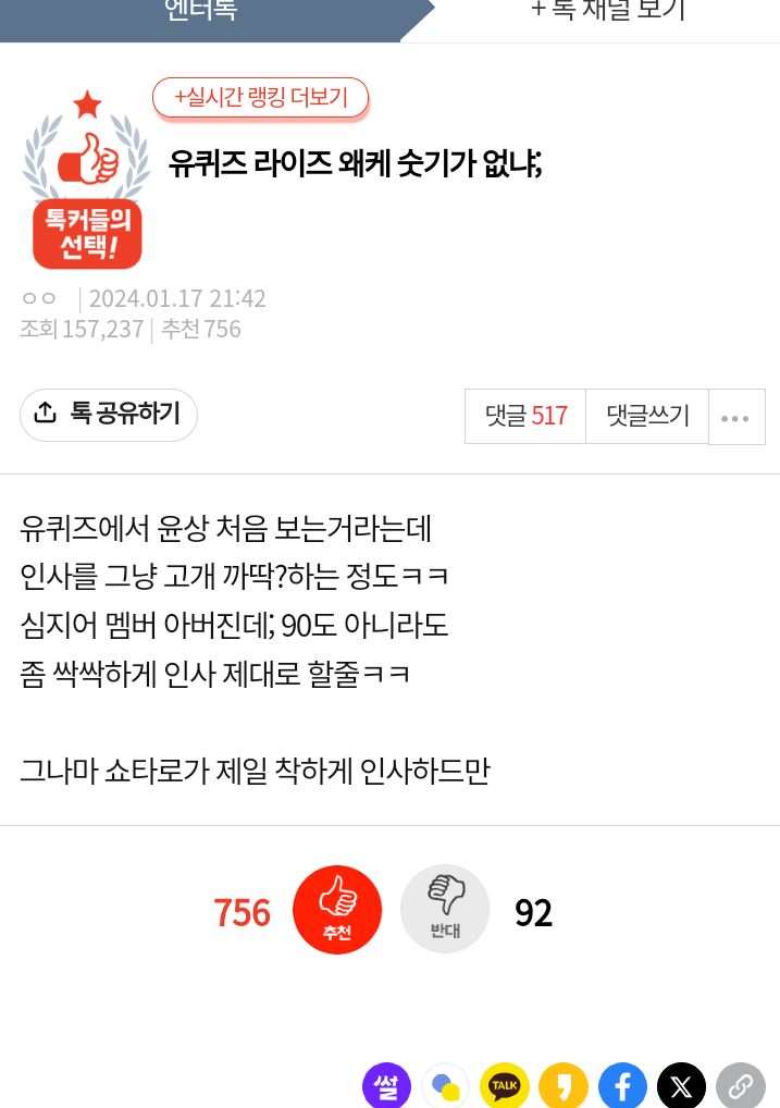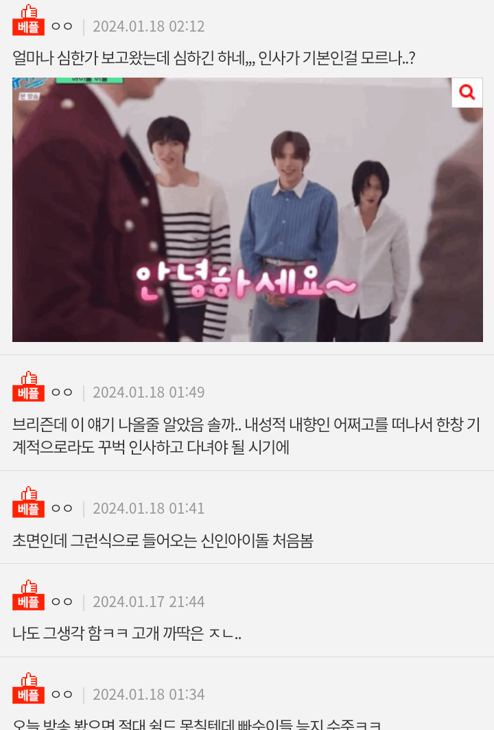 어제자 유퀴즈 예능에 윤상과 라이즈가 나왔음 근데 이 장면에서 인사를 제대로 안해서 욕먹는 중
