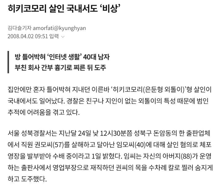 우리나라도 히키코모리가 계속 늘고 있다고 해