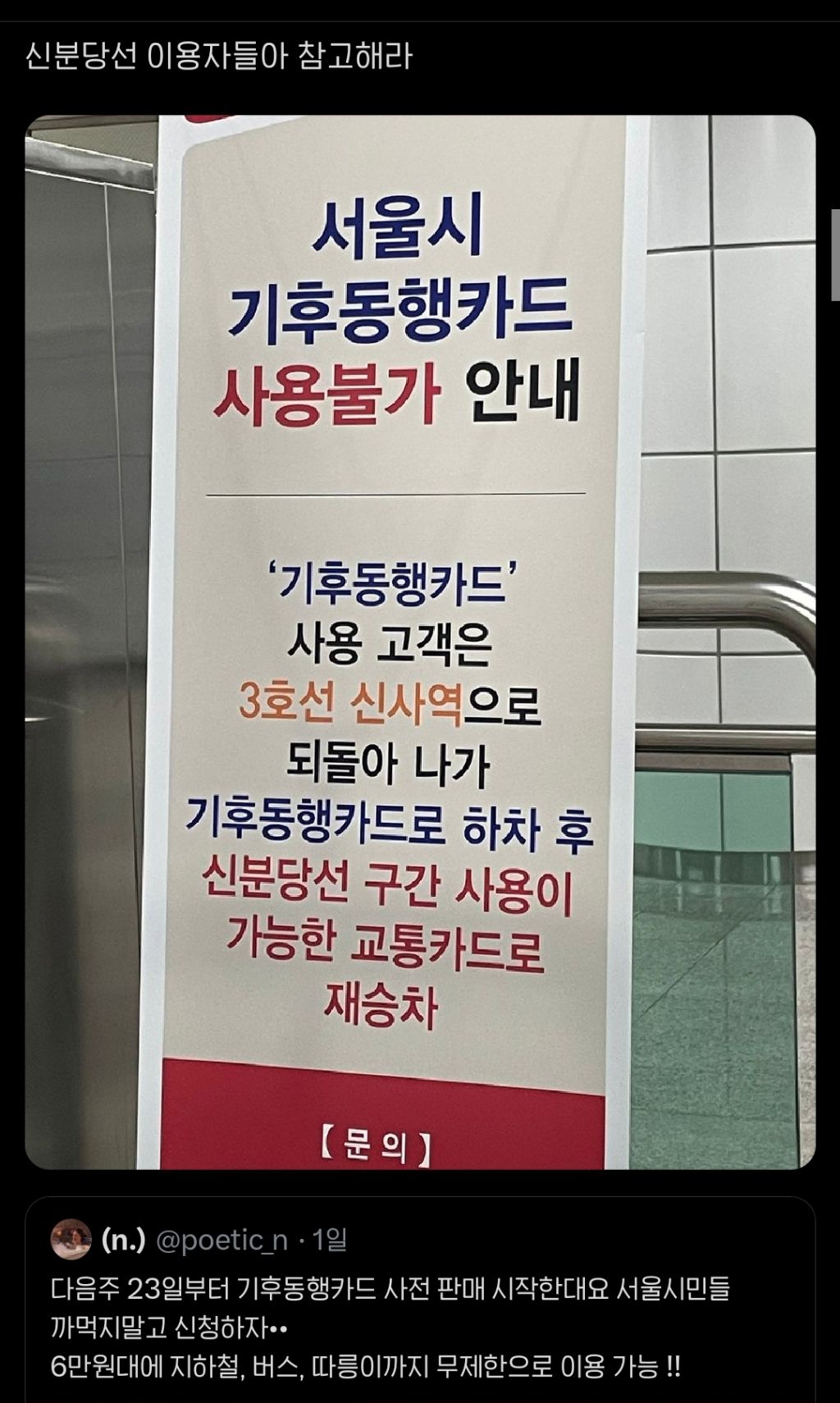 작성자탁구왕이되어보자 작성시간 24.01.19 시발 존나 비싼데 매년 올라 매년....연말정산 보는데 교통비 120만원이야.....난 심지어 버스 거의 안타고 신분당 정기권만 끊어서 쓰는데도 하...ㅋㅋ 기후동행카드 안될거같긴 했지만 저거 배너 보는 순간 빡치긴 또 빡침 ㅠ